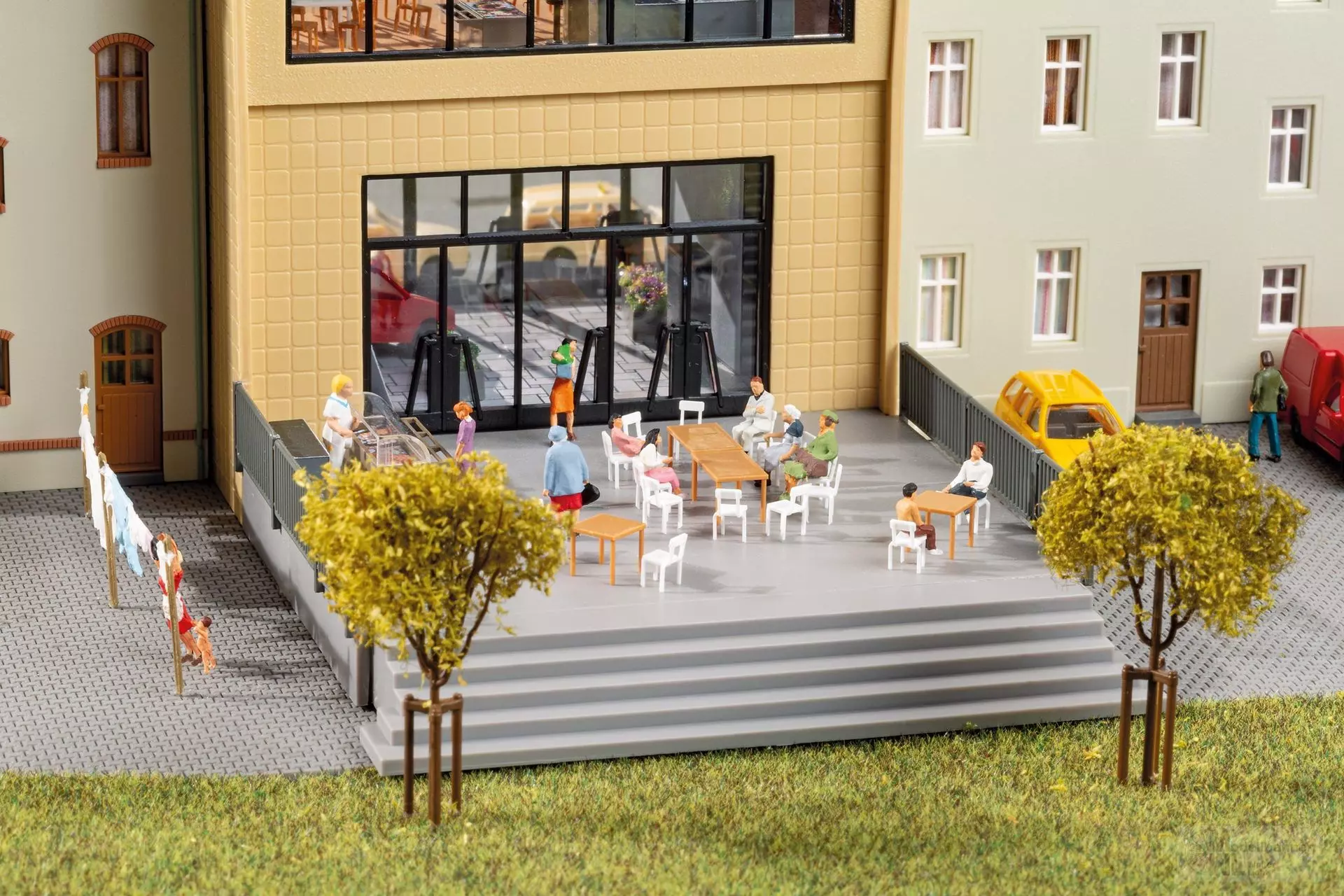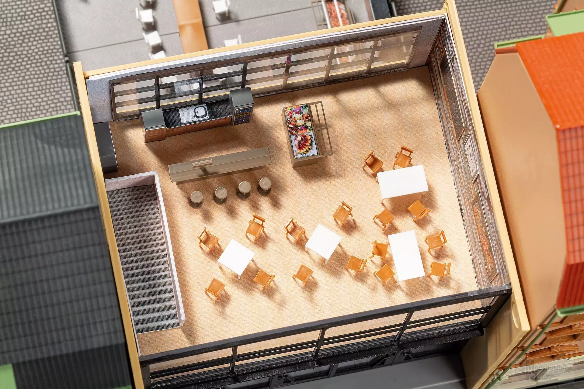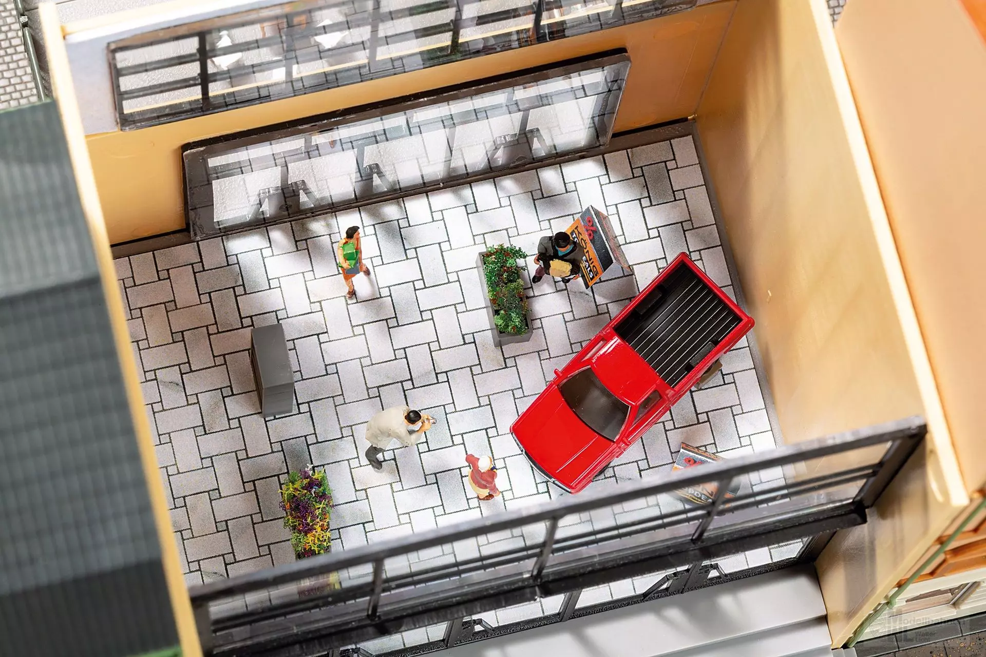 Diese moderne Passage mit großer Glasfront bringt Tiefe in urbane Szenen. Eine sehr umfangreiche Inneneinrichtung liegt bei und lädt zum detaillierten Ausbau ein. In der oberen Etage befindet sich ein Bistro. Über einen Übergang gelangt man zu einer Terrasse mit Tischen und Stühlen im Hof, ideal für belebte Innenstadtszenen.