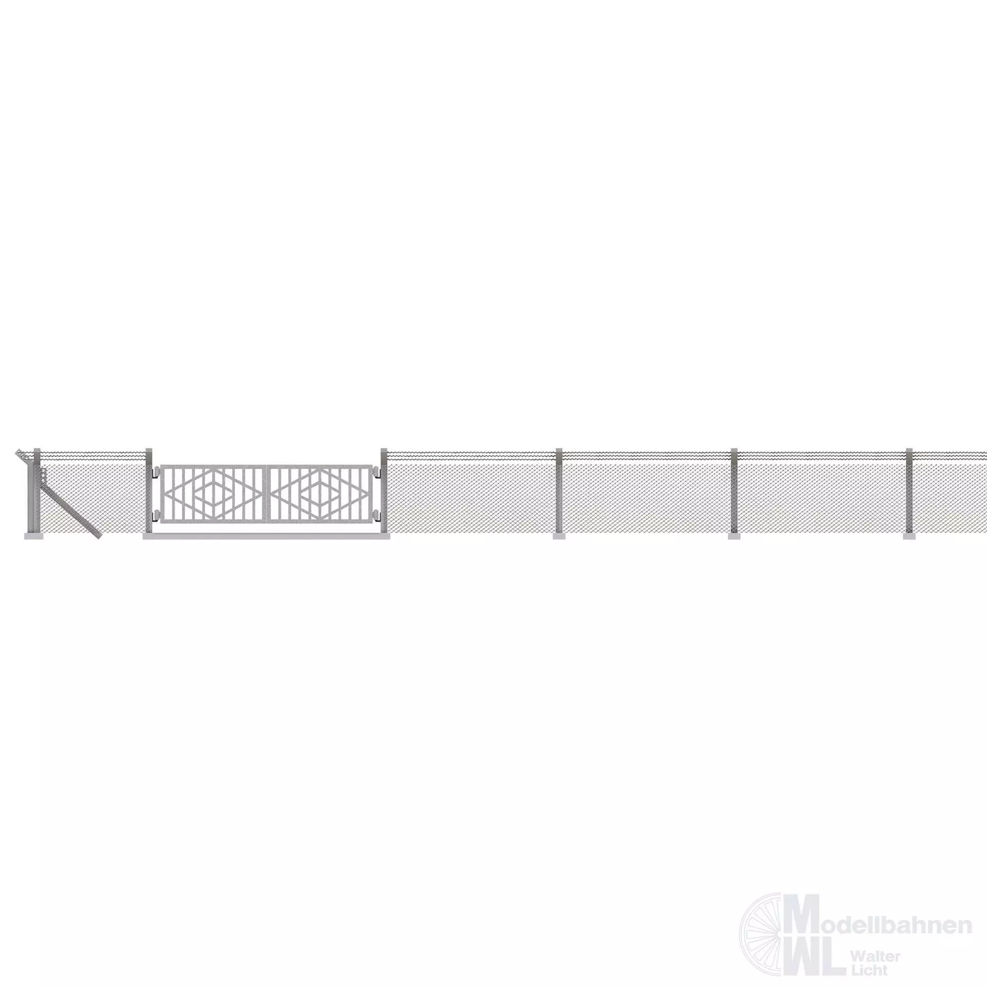 Vielseitig einsetzbarer Maschendrahtzaun für Industriegelände, Fabriken, militärische Anlagen usw. Betonpfosten mit Übersteigschutz. Großes Metalltor mit 2 Flügeln zum Öffnen. Gesamtlänge: 700 mm. Bausatz.
