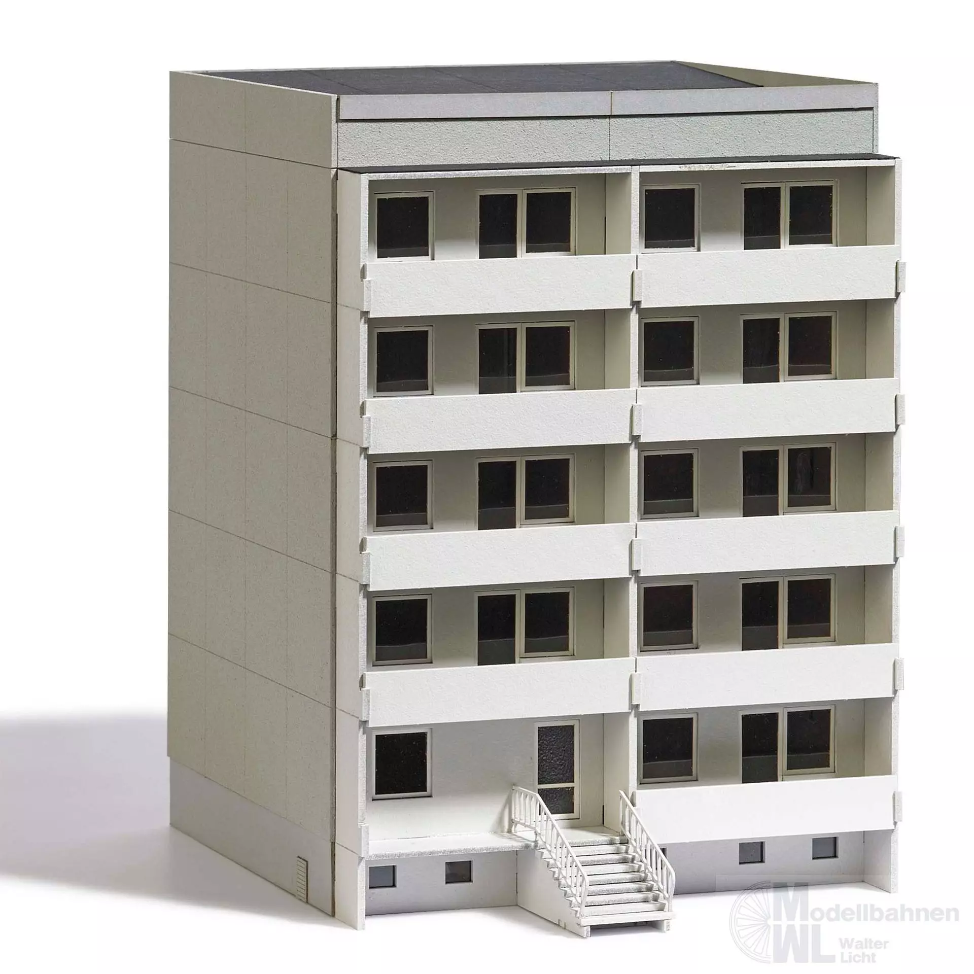 Bausatz für ein 5-stöckiges Gebäude mit Eingang und Windfang auf der Vorderseite sowie Balkonen und Treppe auf der Rückseite. Erweiterung der Etagen mit TT 8892 Aufstockung möglich. Beleuchtbar mit Busch LEDs 5998. Bausatz. Größe: 144 x 102 mm, 142 mm hoch.