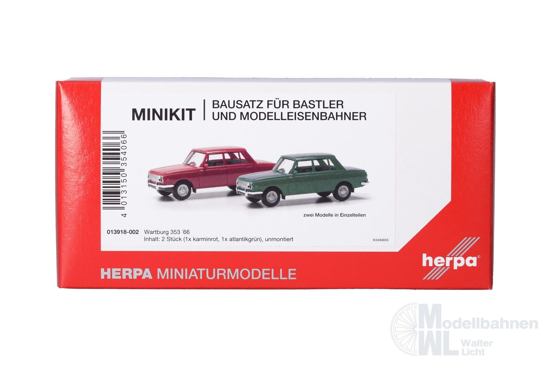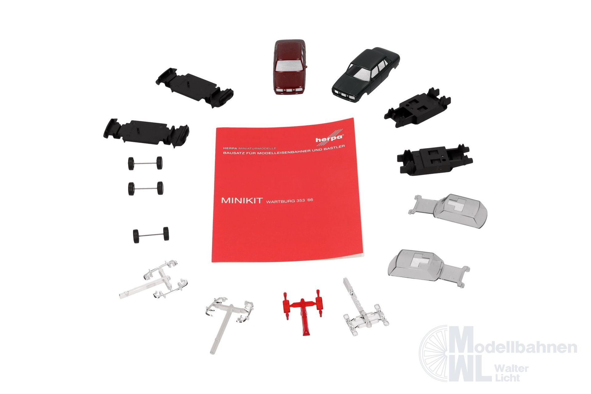 MiniKits sind original Herpa Modelle als Bausätze für Modelleisenbahner und Sammler. Der Wartburg 353 `66 wird aktuell in den Farben Karminrot und Atlantikgrün produziert. MiniKits lassen sich aufgrund der Herpa Schnappbauweise mit wenigen Handgriffen ohne Kleber zusammenbauen (Montageanleitung liegt bei). So kann die Modellanlage preiswert mit Autos bestückt oder ein Autotransportzug günstig mit PKW beladen werden. Und Airbrusher können vor dem Zusammenbau die Karosserie in der eigenen Wunschfarbe lackieren.