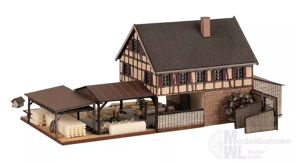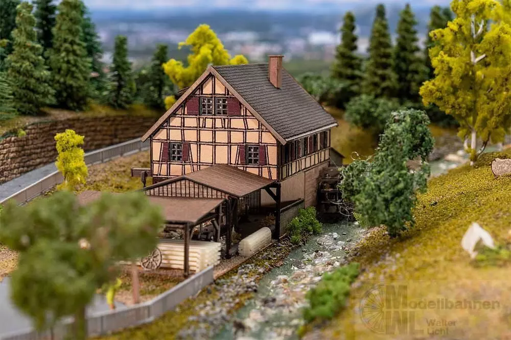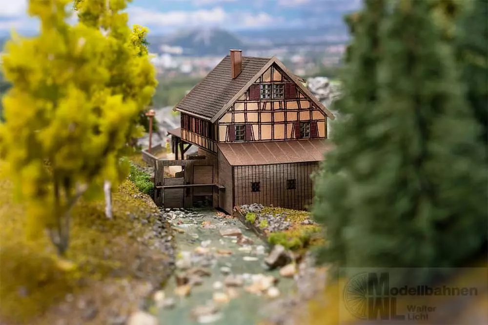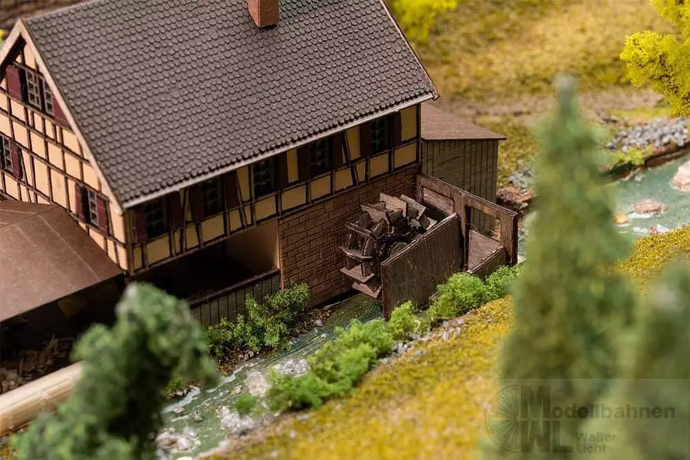 Der Geruch von frisch geschnittenem Holz und Sägespänen, das kräftige Rauschen eines Baches zusammen mit dem gleichmäßigen Klappern des Wasserrads ziehen über die alte Sägemühle mit ihren liebevollen Fachwerkelementen und roten Fensterläden hinweg. Eine kleine Hundehütte und allerlei Holzelemente vervollständigen das Miniaturmodell und fast kann man sich die fleißigen Miniatur-Arbeiter bei der Arbeit vorstellen. Eine perfekte Gelegenheit, um der Modellbauanlage etwas historisches Detail einzuhauchen.