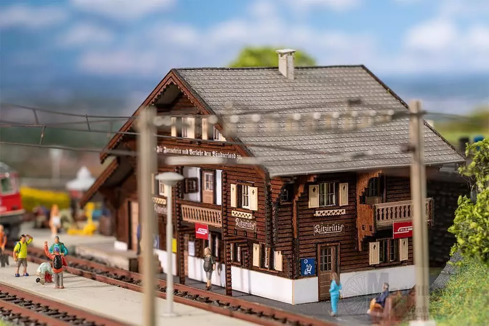 An der historischen Arosabahn in der Schweiz, die seit 1914 durch atemberaubende Landschaften fährt, steht der historische Bahnhof »Litzirüti« als letzte Schanfigger Zwischenstation auf dem Weg nach Arosa. Inspiriert vom Original versprüht das Modell mit seiner dunklen Holzverkleidung und den hellen Fensterläden den Charme vergangener Zeiten. Das tiefe Dach aus grauen Ziegeln krönt die Station. Das Gebäude harmoniert perfekt mit der umliegenden Natur und lädt Miniatur-Fahrgäste dazu ein, einen Moment auf Ihrer Reise innezuhalten, und ist perfekt geeignet, um die Modellbahnanlage zu erweitern.
