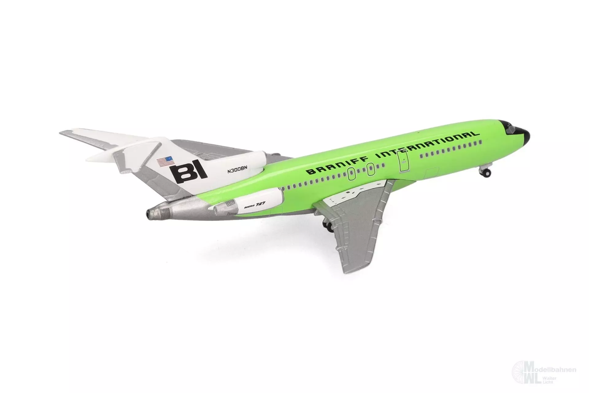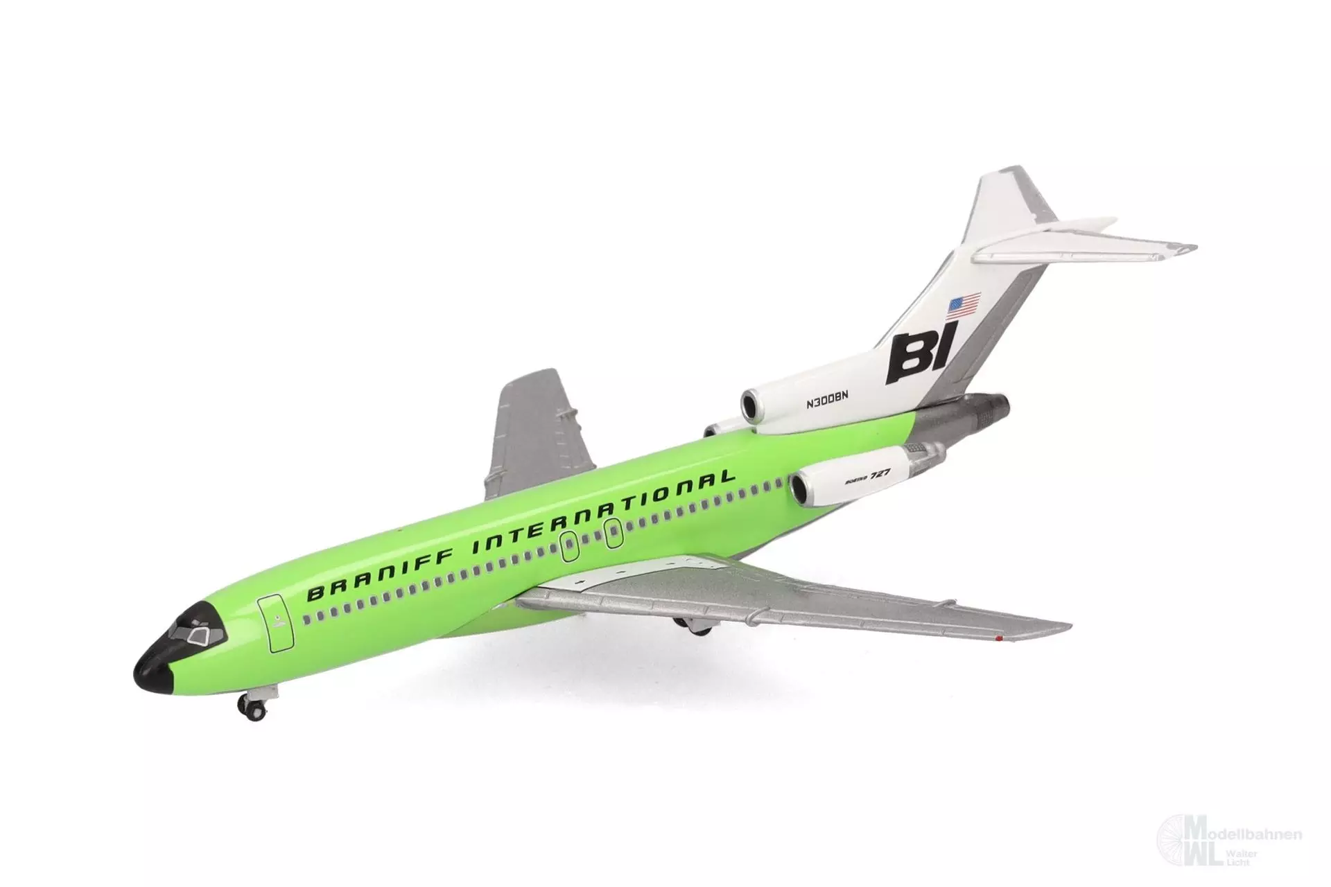 Limettengrün war der letzte Solid-Farbton, den die Agentur Harper & Green für Braniff kreierte und ab September 1967 einführte. Nur jeweils eine BAC 1-11, DC-8 und Boeing 707 erhielten die frisch-freundliche Farbe, allerdings gleich sechs Boeing 727. Einer dieser Dreistrahler mit der Kennung N300BN ist auch die Vorlage zu dieser limitierten Neuheit im Maßstab 1:500. 1969 an Braniff geliefert, verblieb sie bis 1982 in der Flotte der texanisches Airline.