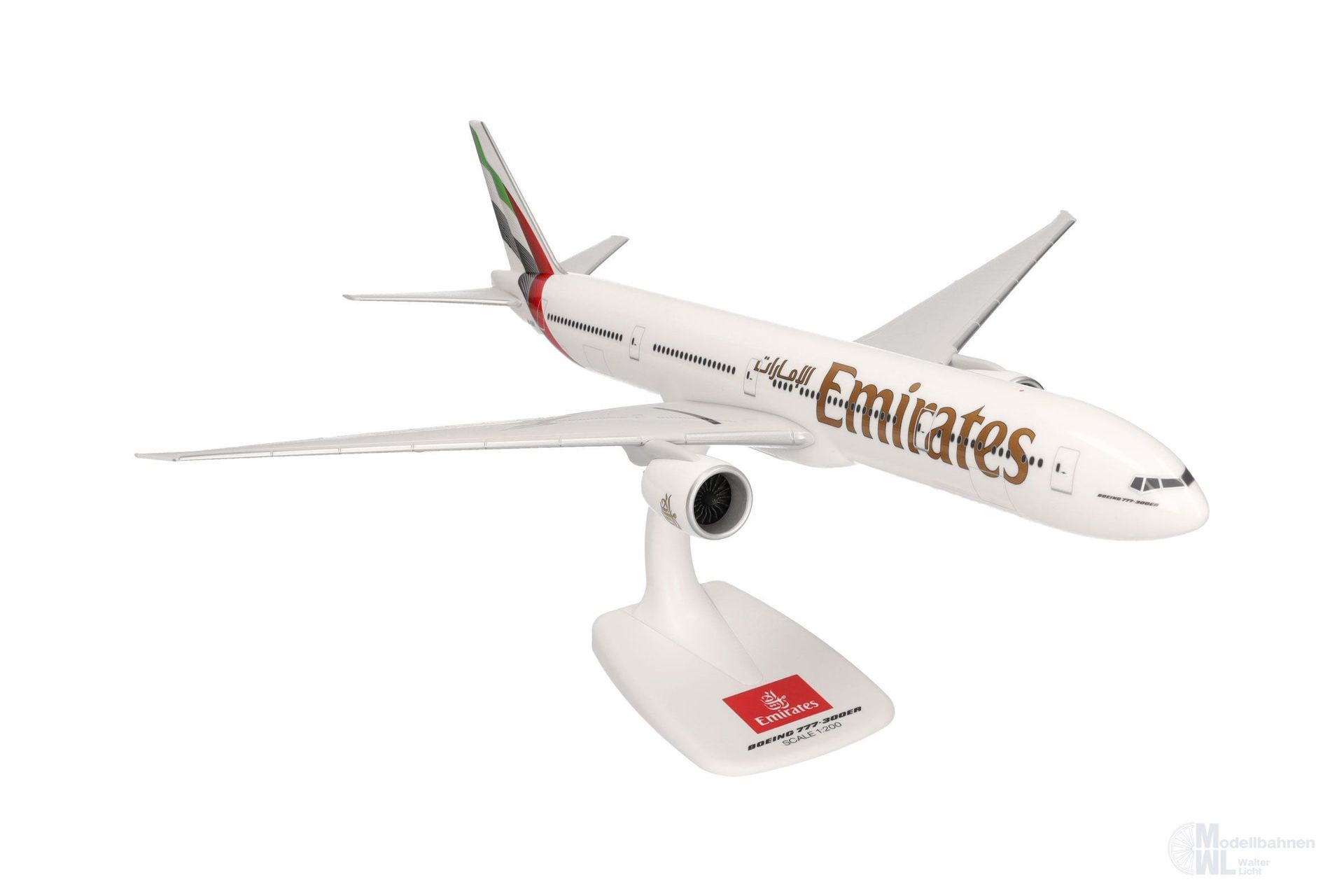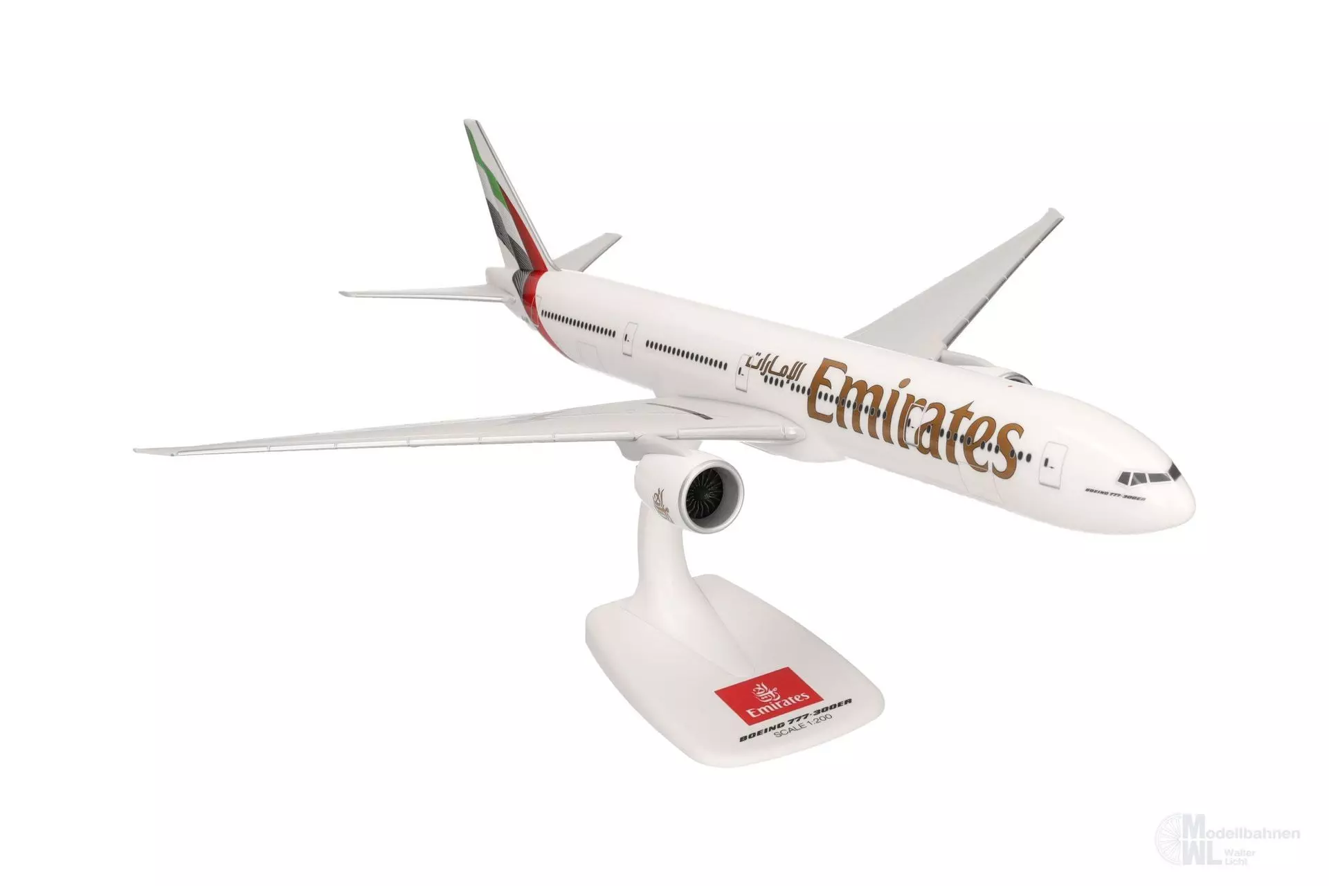 2023 frischte die in Dubai beheimatete Airline nach 24 Jahren ihre Bemalung auf. Die Flagge am Heck und am Leitwerk erhielt einen 3D-Effekt und der Emirates-Schriftzug am Rumpf wurde erheblich vergrößert. Die Triple Seven gesellt sich nun zum Airbus A380, der unter der Artikelnummer 614054 bereits mit dem überarbeiteten Farbschema erhältlich ist. © 2024 Emirates Group