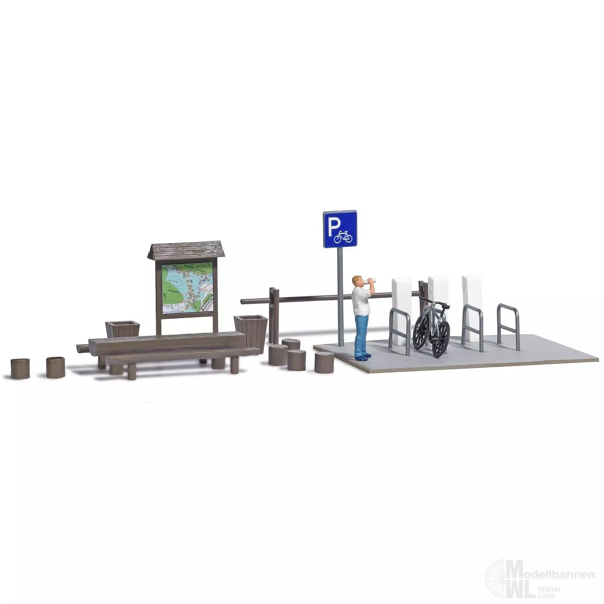 Nicht nur das Bike benötigt wieder etwas Strom, auch unser Biker gönnt sich gern eine Pause. Set mit Biker-Figur, E-Bike, Fahrradparkplatz mit 3 Ladesäulen, 4 Anlehnbügeln und Schild sowie Holztisch mit 2 Bänken, 6 Holzpflöcken, überdachter Hinweistafel, Holzschranke und 2 Abfallkörben zur Ausgestaltung eines Radweges.