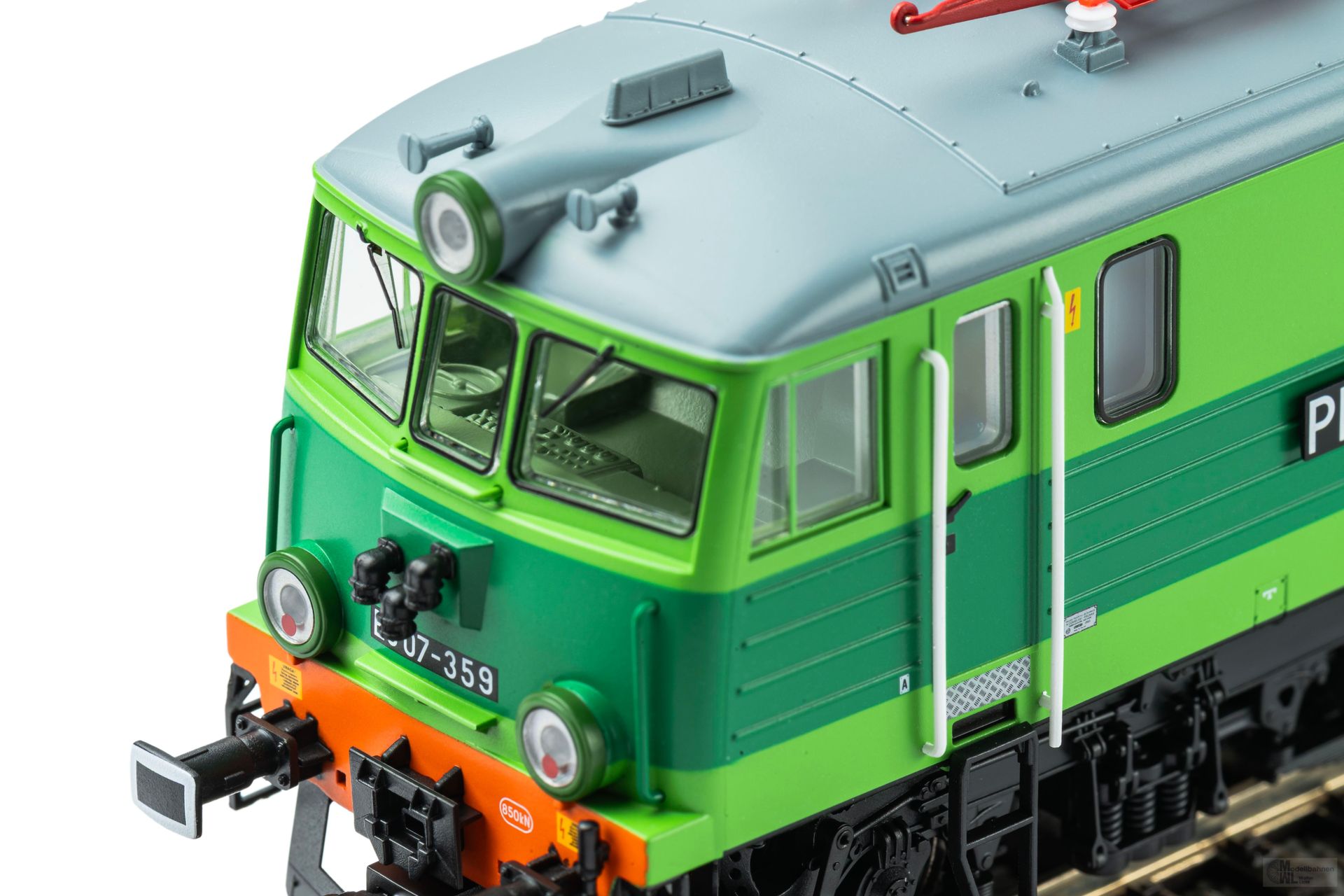 Neuheit 2025: Druckvariante der EU07 als EP07 der PKP in Epoche V. Die EP07 überzeugt als Expert Modell mit vielen angesetzten Teilen, wie Signalhörner, Dachantennen, montierte freistehende Griffstangen und Treppen und stimmigen Lampen. Das Modell besitzt filigrane Stromabnehmer und originalgetreue Nachbildungen der Pufferbohlen. Die Beleuchtung erfolgt mittels LEDs. Die Führerstandbeleuchtungen und die fahrtrichtungsabhängig funktionierenden Front- und Schlusslichter sind mit einem PluX22-Decoder digital schaltbar. Der schwere Rahmen aus Zinkdruckguss und der Motor mit zwei großen, präzise ausgewuchteten Schwungmassen sorgen für ausgezeichnete Fahreigenschaften und hohe Zugkräfte. Das Modell besitzt ab Werk einen PIKO Sound-Decoder mit passendem Lautsprecher. Als Besonderheit ist die Umschaltung auf Oberleitungsbetrieb möglich.