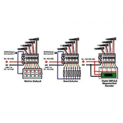 Der Anschluss der Weichen, des Stellpultes und der Stromversorgung erfolgt über Schraubklemmen. Weiterhin ist das Schalten mit Reedkontakten und das digitale Schalten mit einem vorgeschalteten Magnetartikel-Decoder möglich. Löten ist nicht notwendig. Der Anschluss erfolgt an Gleich- oder Wechselstrom mit 10 bis 16 Volt.