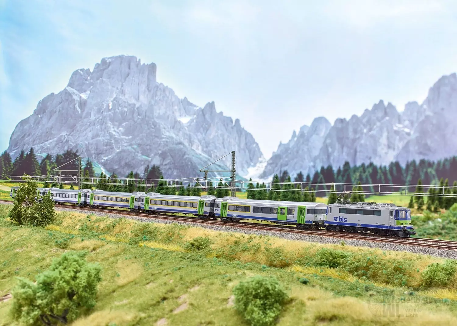 Einen vorbildgerechten Zug erhalten Sie mit der Lokomotive der Baureihe Re 4/4 II Artikelnummer 16884 und mit den Schnellzugwagen aus 18293 und 18294.