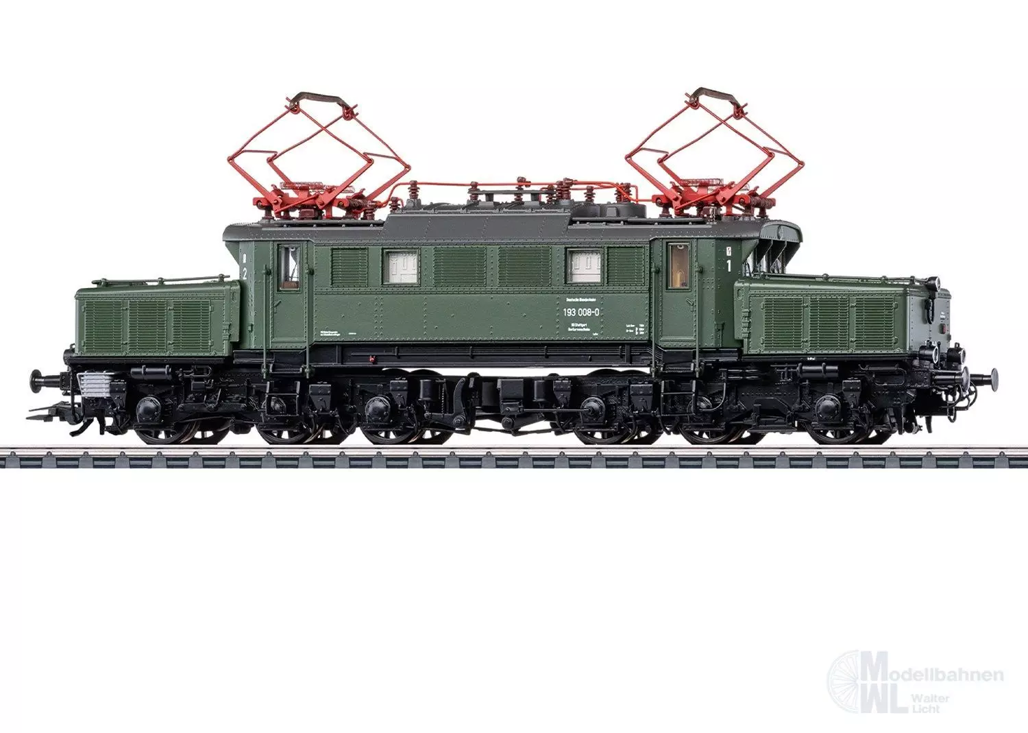 Vorbild: Schwere Güterzug-Elektrolokomotive Baureihe 193 der Deutschen Bundesbahn (DB). Chromoxidgrüne Grundfarbgebung. 6 Sandkästen, Anfahrlampe und Indusi. Lok-Betriebsnummer 193 008-0. BD Stuttgart, Bw Kornwestheim. Betriebszustand um 1976.