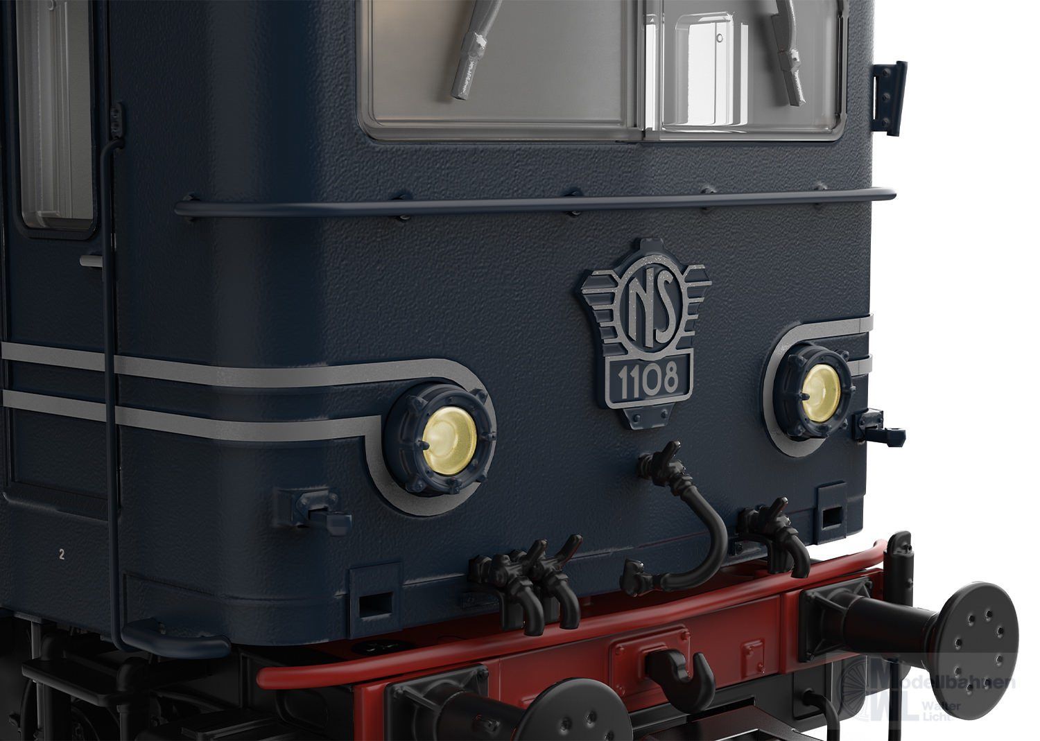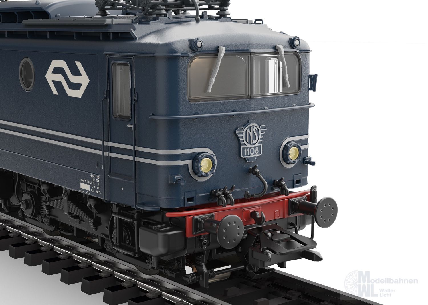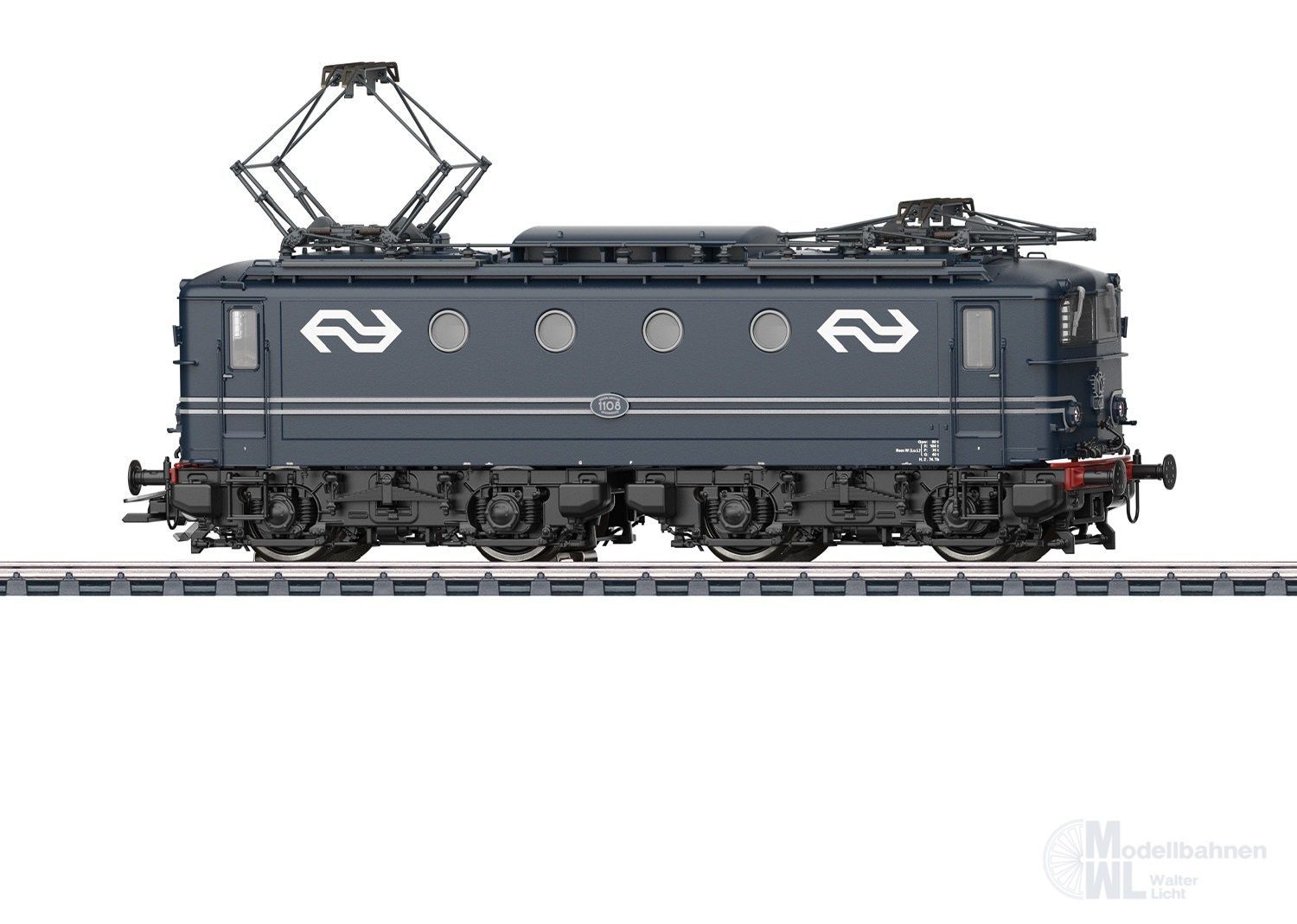 Vorbild: Elektrolokomotive Serie 1100 der Niederländischen Eisenbahnen (NS). Lokomotive aus der 1. Bauserie, ohne Frontverstärkung. Dunkelblauer Lok-Aufbau mit schwarzem Fahrwerk. Mit erhabenen Zierleisten. Drehgestelle mit abgerundeten Aussparungen. Lok-Betriebsnummer 1108. Betriebszustand Mitte der 1970er Jahre.