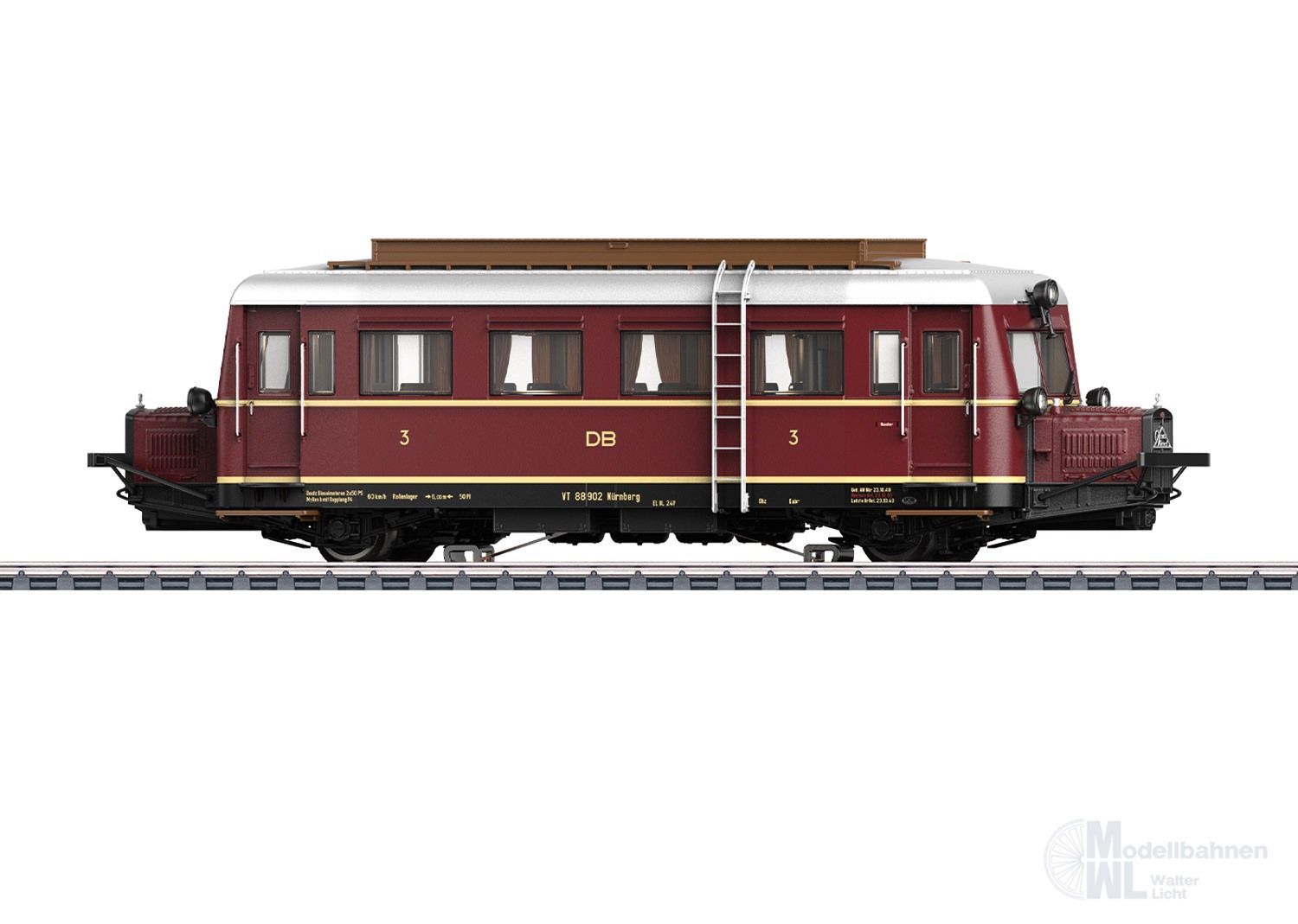 Vorbild: Dieseltriebwagen Cvt-34 „Wismarer Schienenbus“ (Typ "Hannover A") als VT 88.9 der DB. Farbgebung purpurrot. Zustand um 1950. VT 88 902, Nürnberg.
