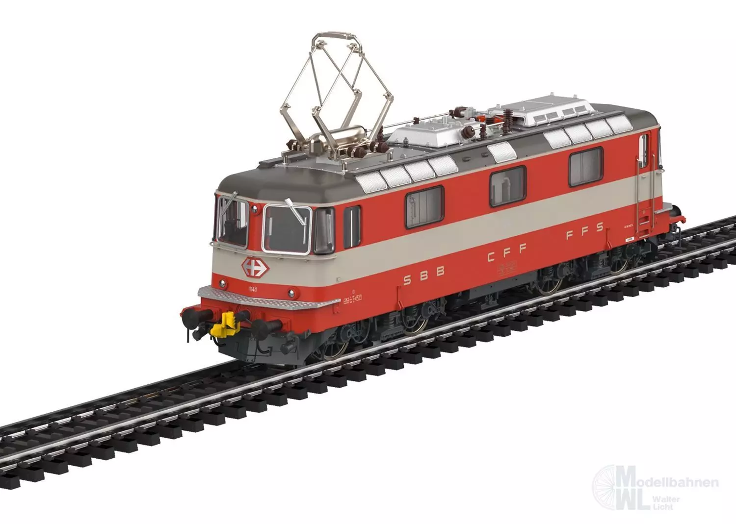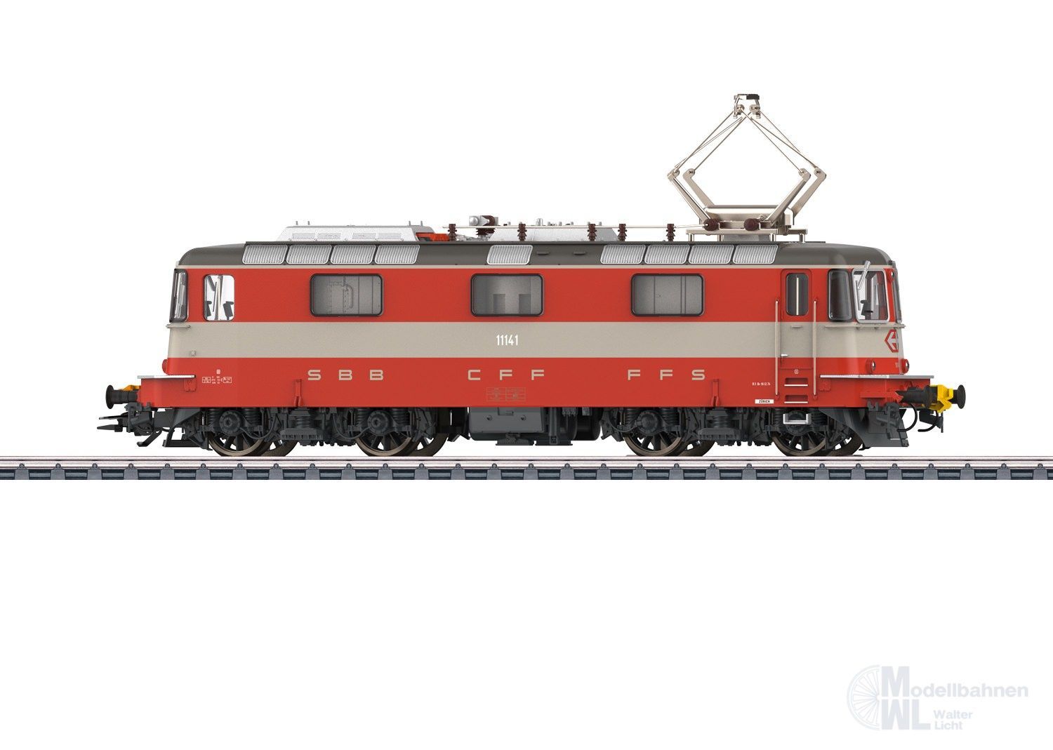 Vorbild: Elektrolokomotive Re 4/4 II, 1. Bauserie der Schweizerischen Bundesbahnen (SBB). Kieselgrau/Blutorange Grundfarbgebung als Zuglokomotive des Swiss Express. Betriebsnummer 11141. Betriebszustand ab 1975.