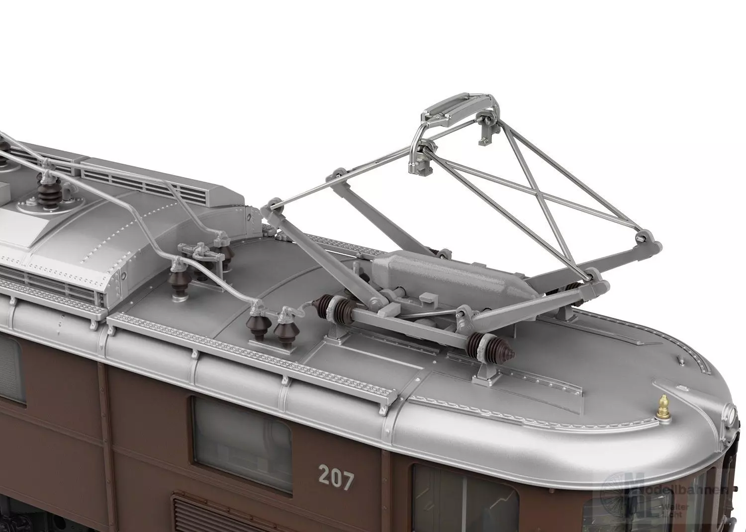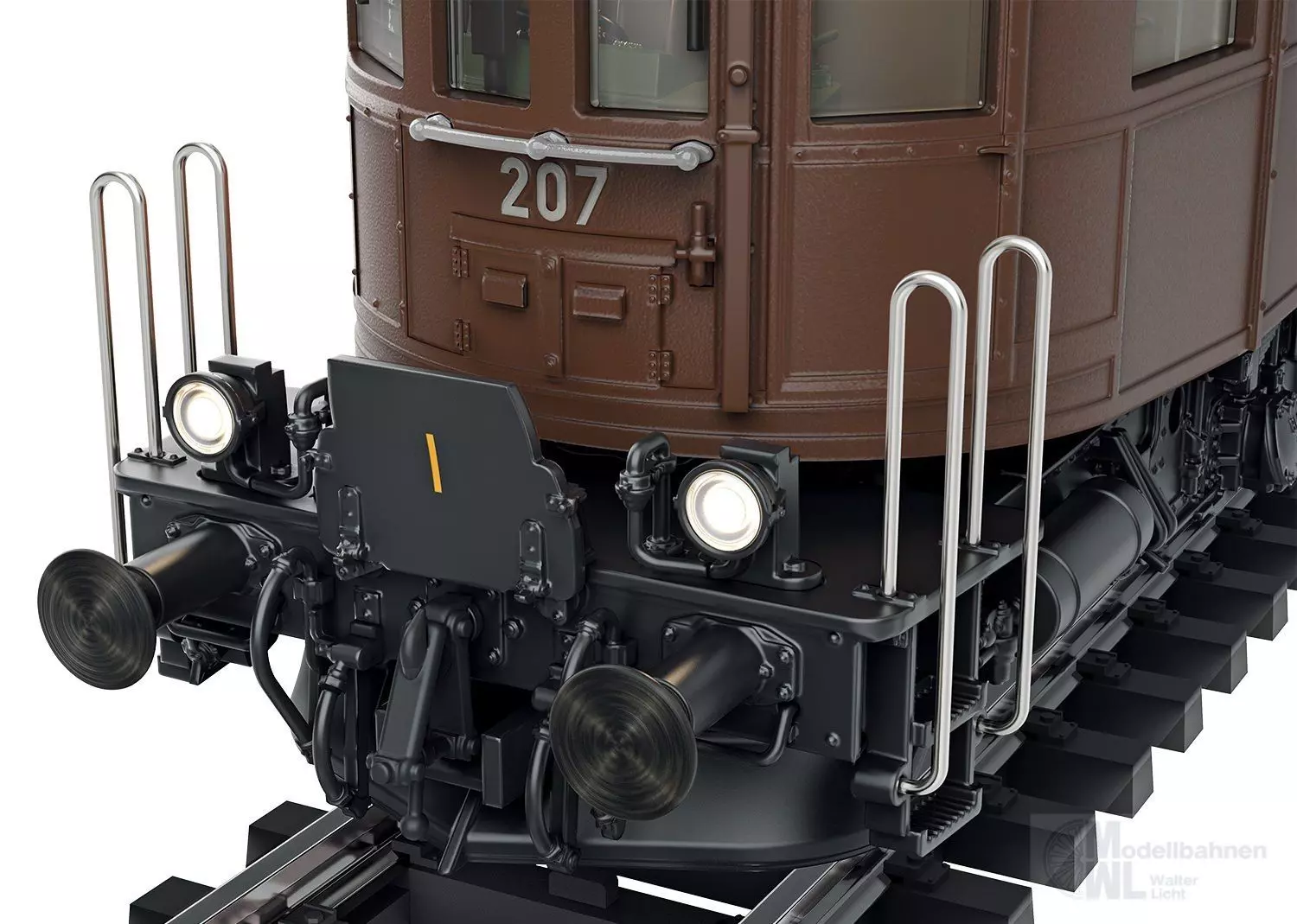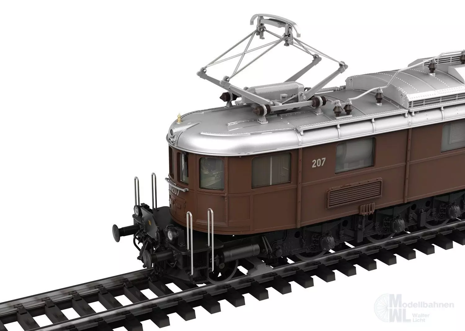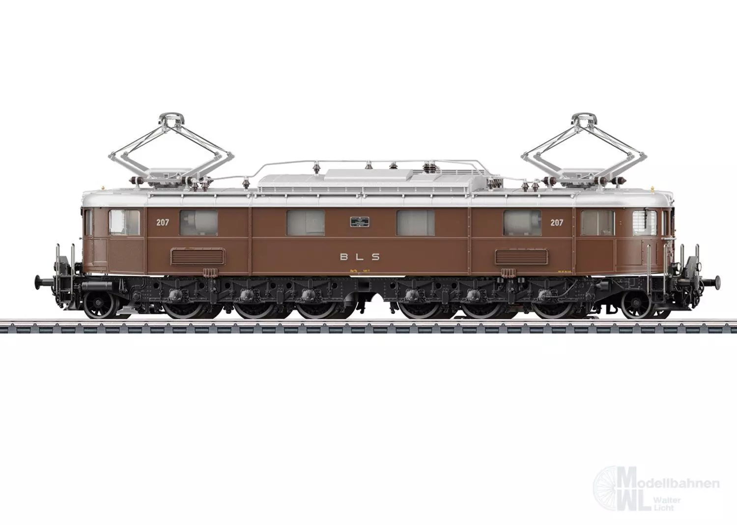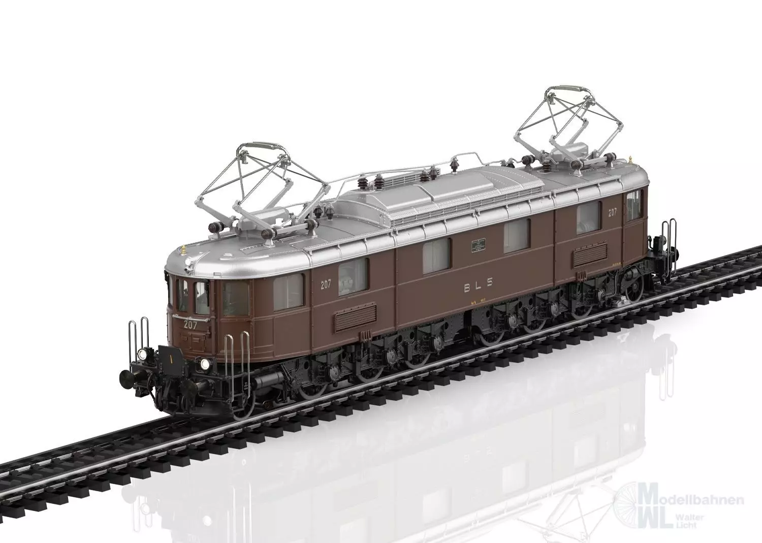 Vorbild: Elektrolokomotive Ae 6/8 der Bern-Lötschberg-Simplon Bahn (BLS). Lokomotive aus der 2. Bauserie. Dunkelbraune Grundfarbgebung mit schwarzem Fahrwerk. Ausführung im ursprünglichen Zustand mit 2 Pantographen und Bremswiderständen im Maschinenraum. Mit stirnseitigen Übergangsblechen und Falschfahrsignal. Signum-Integra Magnet am Lokende II. Längsseitig jeweils mit 4 Maschinenraum-Fenstern und Lamellen-Lüftergittern. Lok-Betriebsnummer 207. Betriebszustand Ende 1940er-/Anfang 1950er-Jahre.