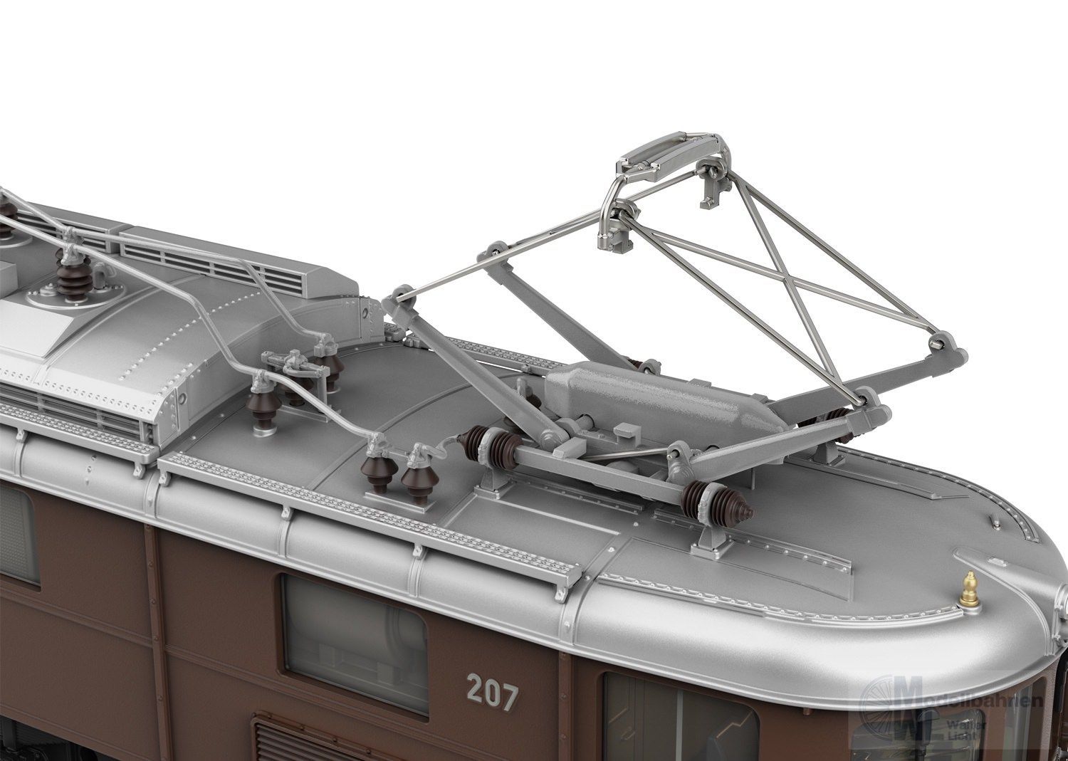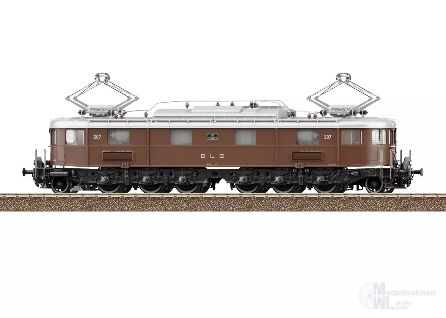 Vorbild: Elektrolokomotive Ae 6/8 der Bern-Lötschberg-Simplon Bahn (BLS). Lokomotive aus der 2. Bauserie. Dunkelbraune Grundfarbgebung mit schwarzem Fahrwerk. Ausführung im ursprünglichen Zustand mit 2 Pantographen und Bremswiderstände im Maschinenraum. Mit stirnseitigen Übergangsblechen und Falschfahrsignal. Signum-Integra Magnet am Lokende II. Längsseitig jeweils mit 4 Maschinenraum-Fenster und Lamellen-Lüftergitter. Lok-Betriebsnummer 207. Betriebszustand Ende 1940er-/Anfang 1950er-Jahre.