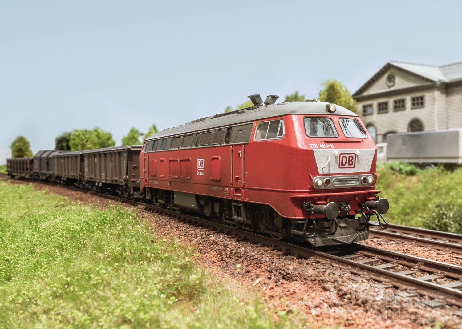Vorbild: Diesellokomotive Baureihe 218 der Deutschen Bahn AG. Orientrote Grundfarbgebung. Betriebsnummer 218 464-6. Betriebszustand ab 1999.