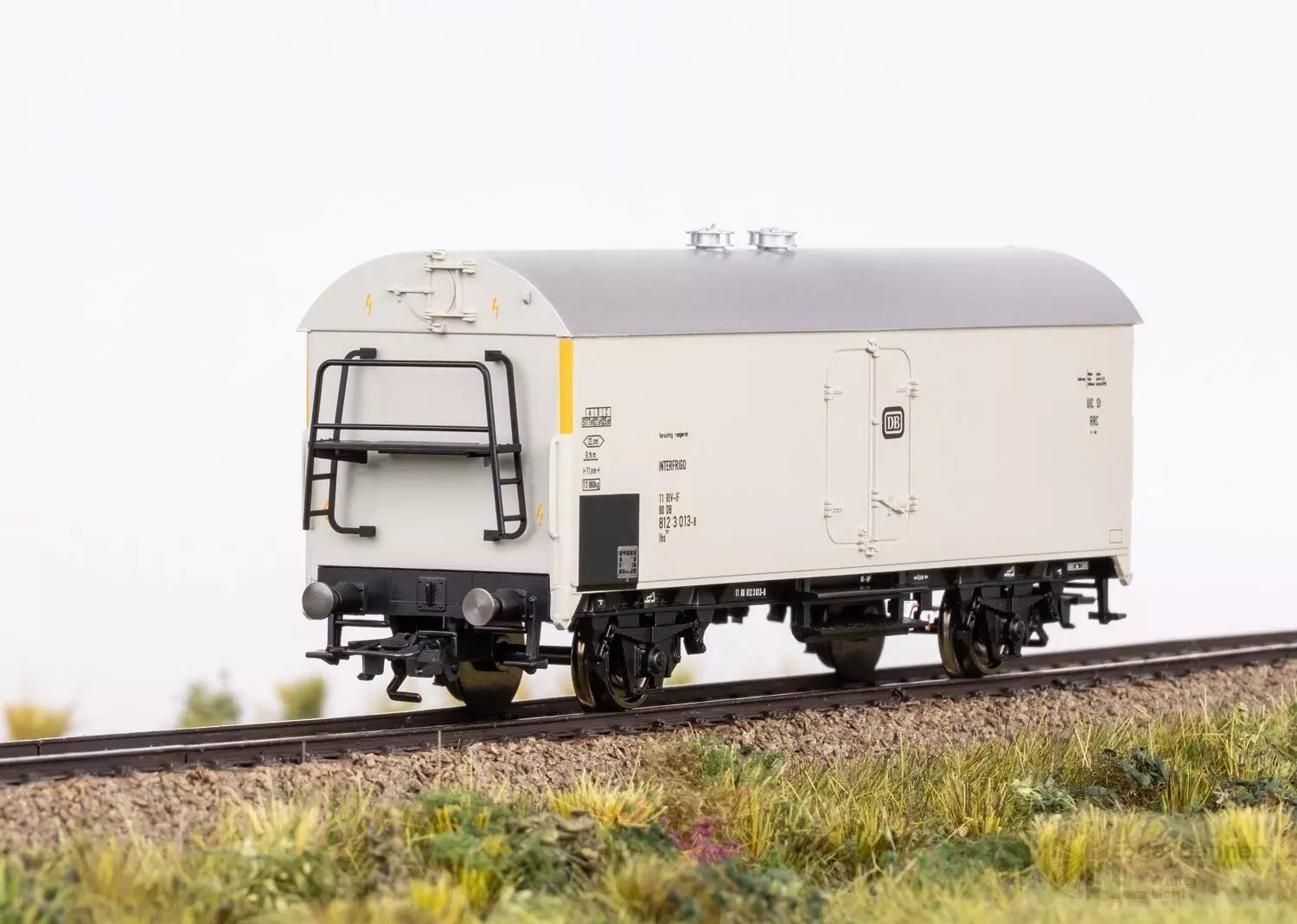 Vorbild: 2-achsiger Kühlwagen Bauart Ibs 377 (ex Tehs 50) der Deutschen Bundesbahn (DB). Mit stirnseitigen Aufstiegsbühnen. Kieselgraue Grundfarbgebung. Betriebszustand um 1983.