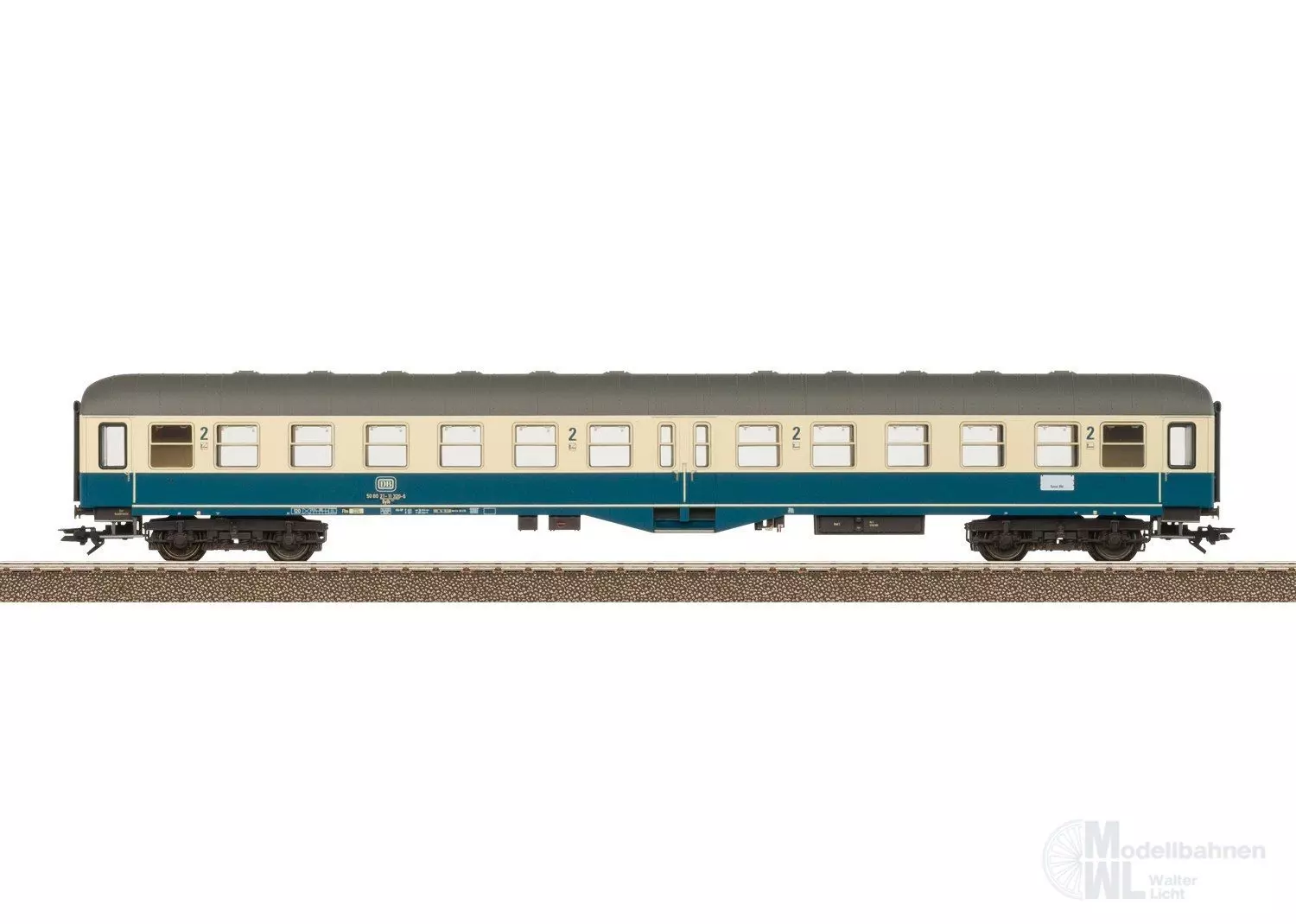 Vorbild: Reisezugwagen 2. Klasse der Deutschen Bundesbahn (DB) für sogenannte leichte Schnellzüge (LS). Bauart Bylb 421. Umgangssprachlich auch als „Mitteleinstiegswagen“ bekannt. Ausführung mit stirnseitig oben liegenden kleinen Schlussleuchten und einteiligen Fenstern an den Einstiegen am Wagenende. Farbgebung in Ozeanblau/Elfenbein. Betriebszustand um 1980.