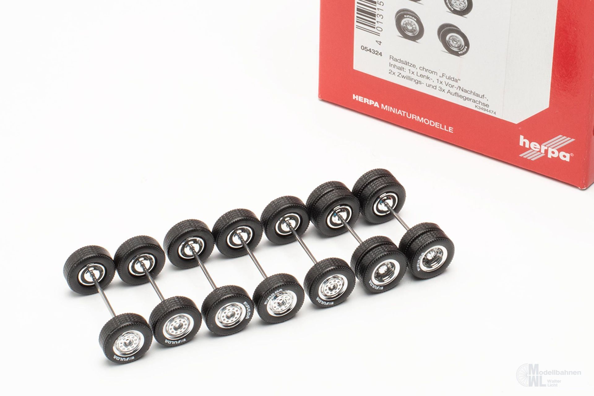 Mit diesem Zubehörset der bedruckten FULDA-Reifen auf Chromfelgen kann man wahlweise eine Zugmaschine oder einen Motorwagen (2achs oder 3achs) und einen Anhänger oder Auflieger (2achs oder 3achs) umrüsten. Das Set beinhaltet eine Lenkachse, sowie eine Vor-/Nachlaufachse (mit minimal schmälerer Achse) und zwei Zwillingsachsen die für das Zugfahrzeug herzunehmen sind. Mit den drei verbleibenden Achsen ist dann der Hänger/Auflieger auszustatten.