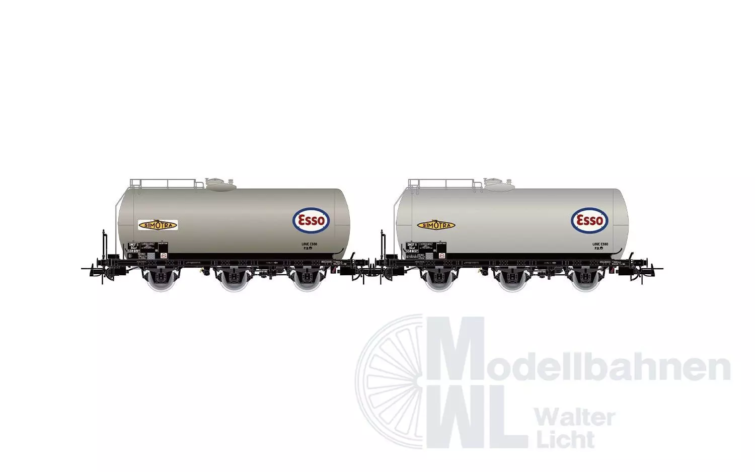 SNCF, 2-tlg. Set 3-achs. Kesselwagen „ESSO“, silberne Farbgebung