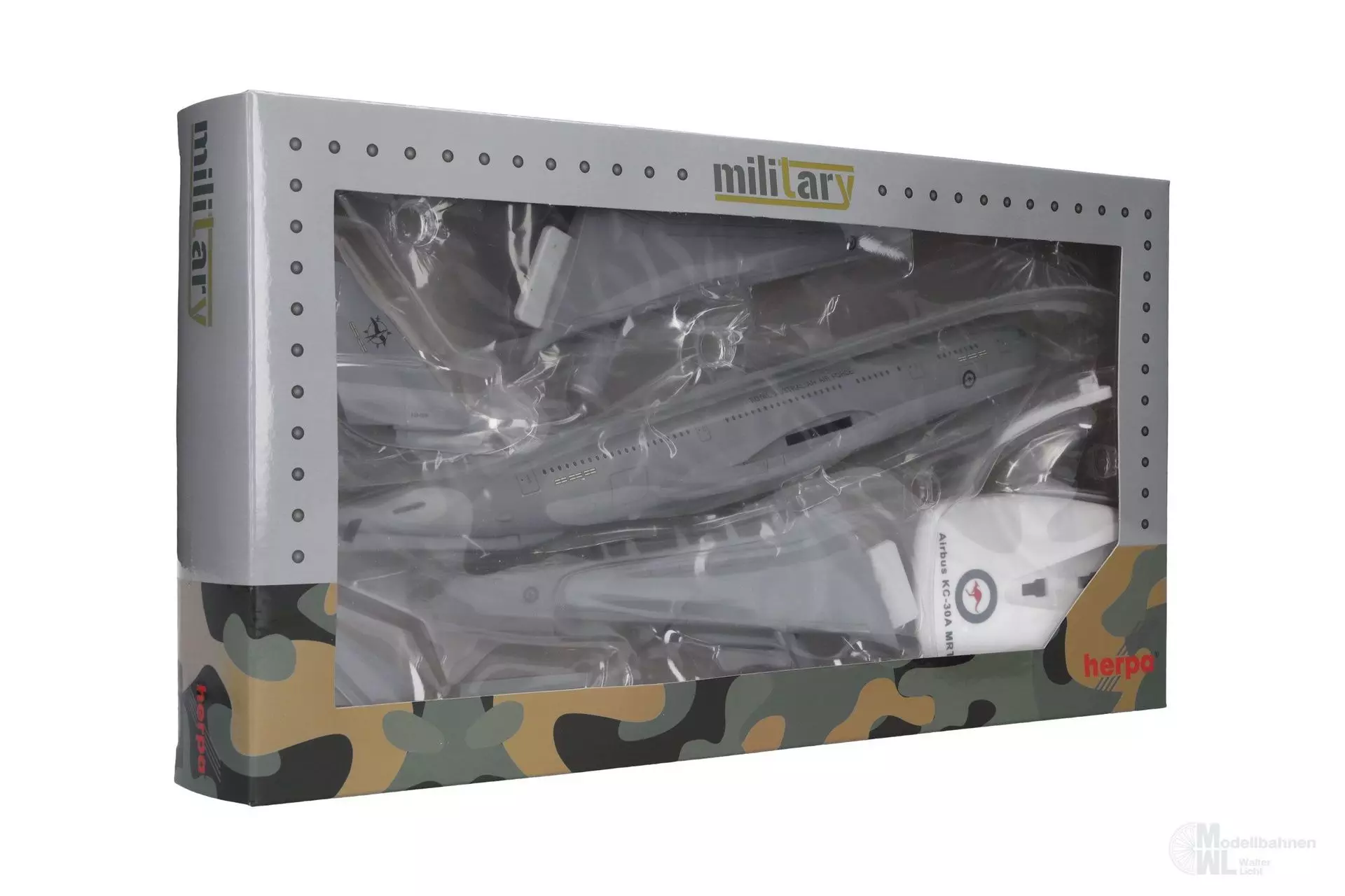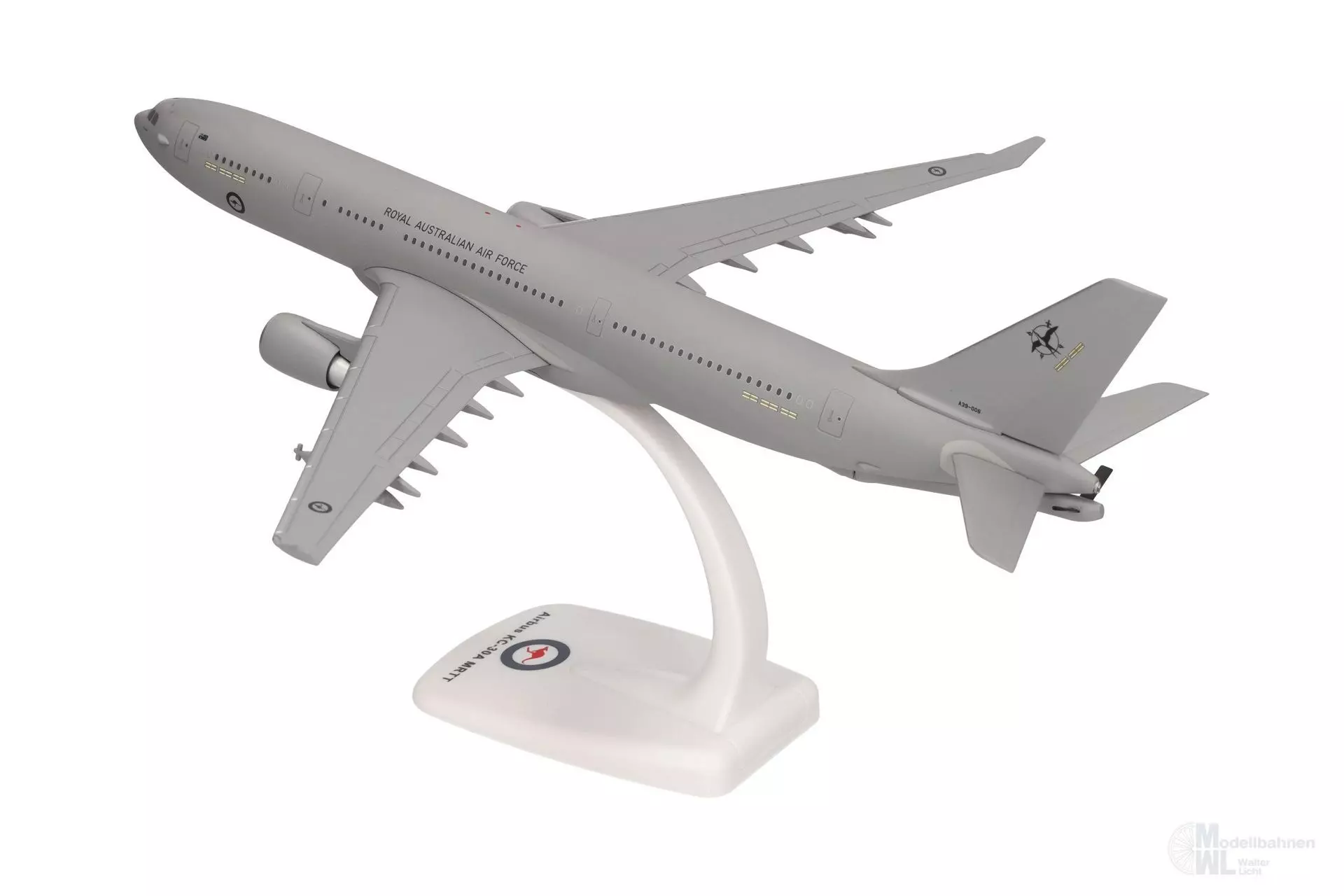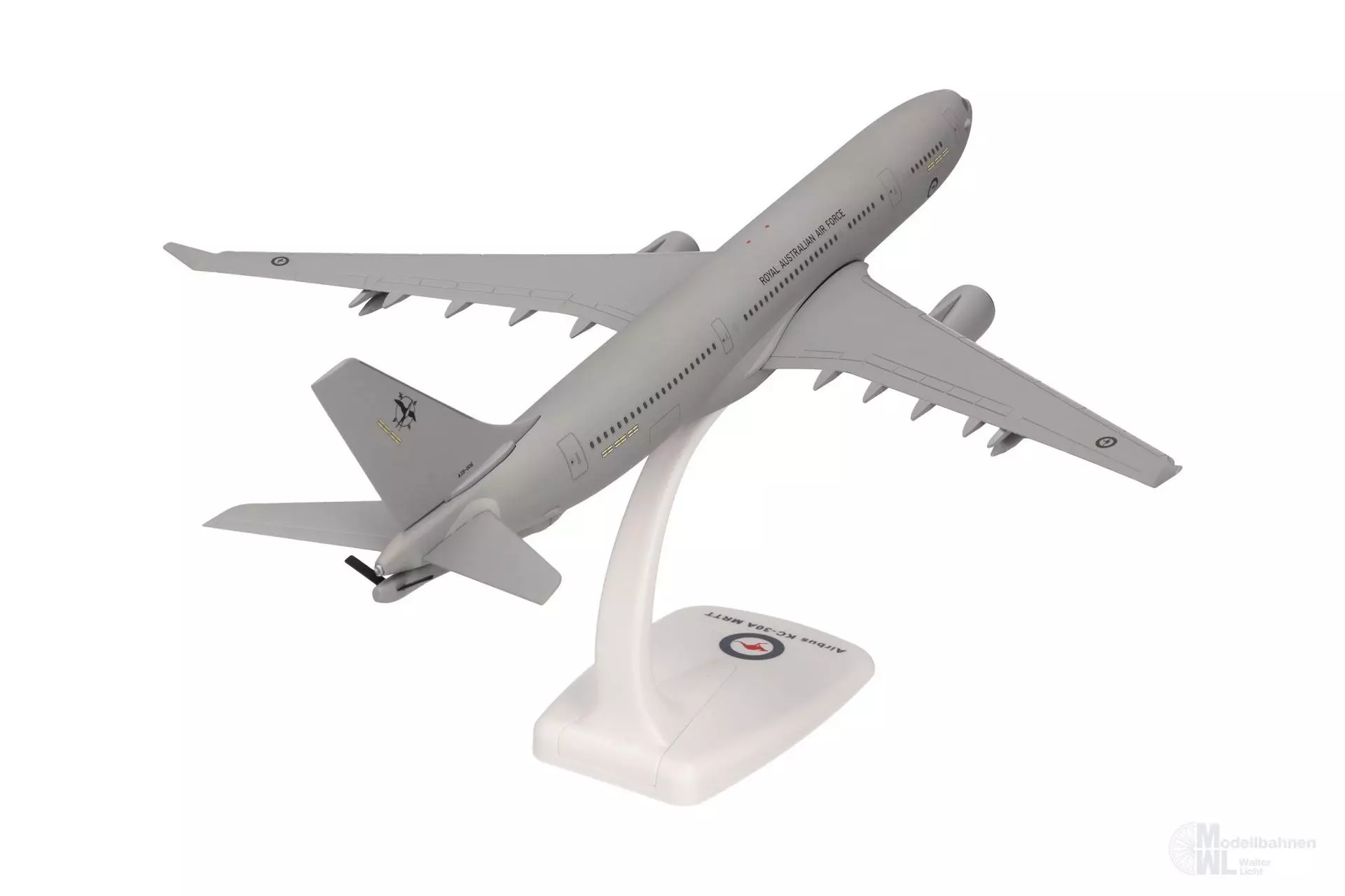 Der mächtige Rumpf des auf der A330-200 basierenden Tankflugzeugs nimmt weit über 100 Tonnen Kraftstoff zur Abgabe an andere Flugzeuge oder stattdessen 45 t Fracht oder 300 Soldaten auf. Unter optimalen Bedingungen kann die A330 MRTT selbst bis zu 14.800 km weit fliegen. Erstkunde wurde Australien und stellte das erste von sieben Exemplaren unter der Bezeichnung KC-30 Voyager Mitte 2011 in Dienst. Bis heute sind es gut zehn Länder, deren Luftwaffen mehr als 80 Maschinen bestellt haben. Neben den Schlauchbehältern auf der Unterseite der Tragflächen, erscheint diese Formneuheit mit dem Tankausleger am Heck, welches bei diesem 1:200er Modell in zwei Positionen dargestellt werden kann.