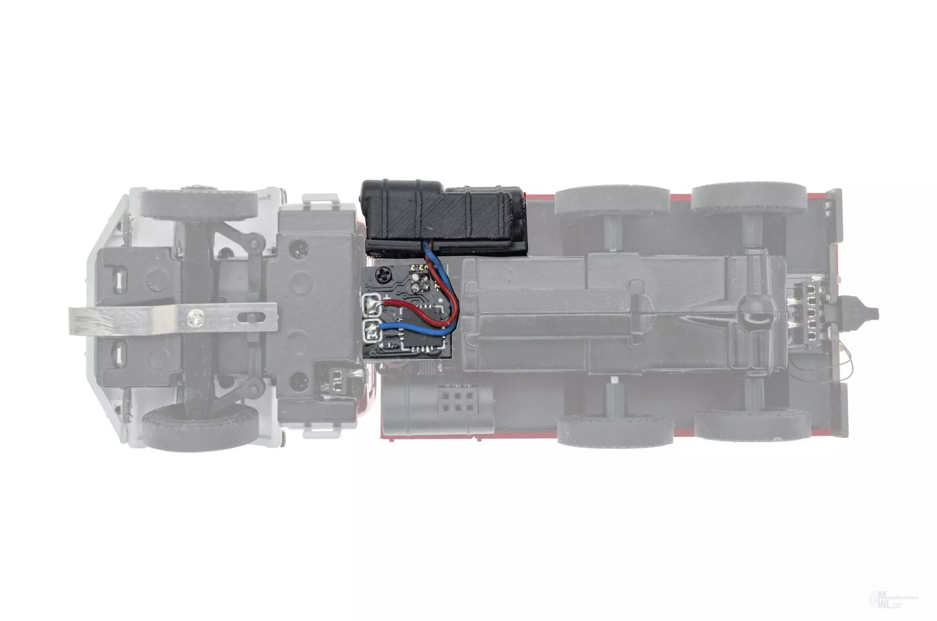 Die Platine des Soundmoduls wird einfach mittels eines vierpoligen Steckers mit der Fahrzeugplatine verbunden und verschraubt. Die bisherigen linksseitigen