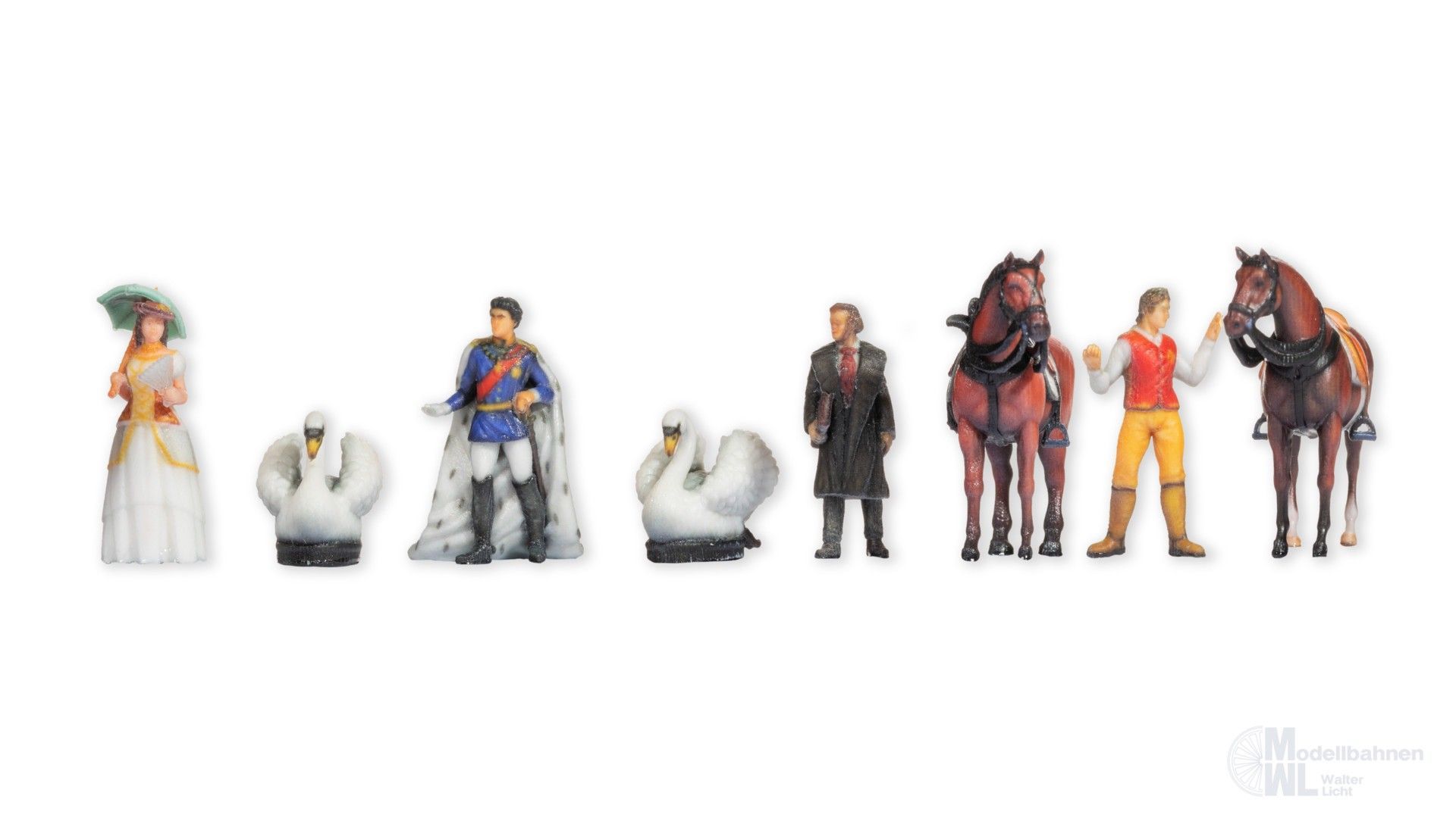 Dem Bausatz liegt ein exklusives Figuren-Set bestehend aus König Ludwig II. von Bayern, Kaiserin Elisabeth „Sisi“, zwei Pferden, einem Burschen, Richard Wagner und zwei Schwan-Statuen bei.