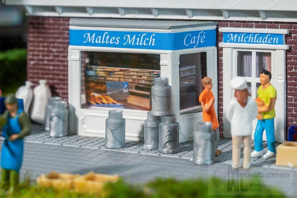Frische Milch für die Miniaturwelt! Die grauen Milchkannen eignen sich perfekt zur Ausgestaltung unterschiedlichster Szenarien. Ob auf dem lebhaften Wochenmarkt oder traditionell auf einem Milchwagen – sie verleihen der Szene einen charmanten Touch und bringen etwas ländliches Leben in die Modelllandschaft.