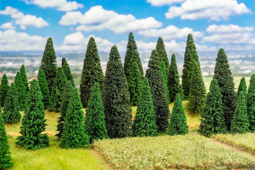 Diese 100 Tannen sind perfekt geeignet, um große Wälder zu gestalten! Die unterschiedlichen Baumgrößen sorgen für Abwechslung auf der Miniaturanlage. Jeder Baum hat einen Standfuß. Kleiner Profi-Tipp: Für einen realistischeren Einbau den Standfuß entfernen, ein Loch in die Anlage bohren und die Tanne mit etwas Kleber einsetzen.