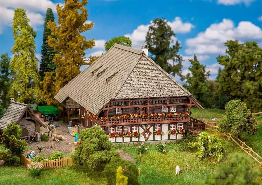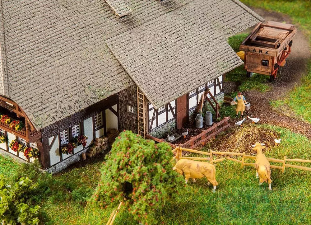 Der große, zweistöckige Schwarzwaldhof bringt mit seiner traditionellen Fachwerkbauweise und dem herabgezogenen Krüppelwalmdach etwas Schwarzwaldcharme auf die Miniaturanlage. Passend dazu sind zahlreiche Zubehörteile enthalten, darunter ein als Blumentrog genutzter Jauchewagen, Sensen, Leitern und weitere liebevolle Ausschmückungselemente, die das Modell perfekt ergänzen.