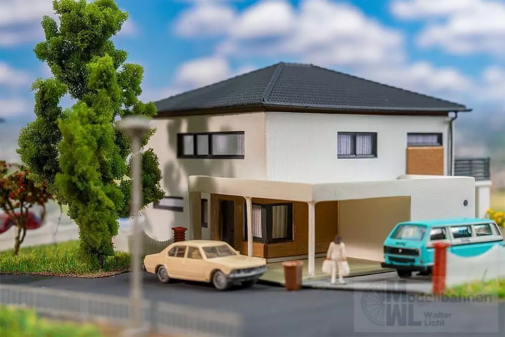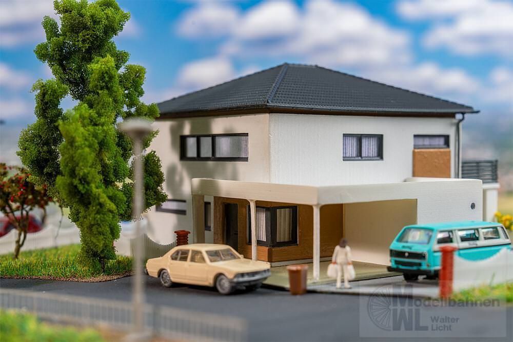 Modernes Stadtleben gefällig? Dieses Modell bringt frischen Wind in jede Vorstadt und verschönert die Modellbauanlage auf stilvolle Weise. Mit seinen weißen Wänden, dem Dach aus schwarzen Ziegeln, dem großzügigen Balkon sowie den eleganten Holzverzierungen und großen Fenstern im Erdgeschoss ist es ein echter Blickfang für Liebhaber zeitgenössischer Architektur.