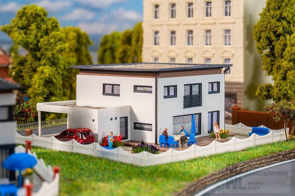 Dieses Miniaturmodell einer WeberHaus-Villa ist mit seiner strahlend weißen Fassade, einem eleganten grauen Akzent, dem zeitgemäßen Flachdach und den großzügigen Fenstern ein wahrer Blickfang für Liebhaber moderner Architektur. Es modernisiert jede Vorstadt und bringt frischen Wind in die Modellbauanlage.