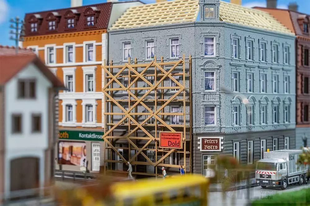 Dieses Stadteckhaus im Umbau verleiht jeder Innenstadt etwas Leben! Im Untergeschoss befindet sich ein Bistro, das Dach und die Fassade befinden sich im Umbau. Auch in der Miniaturwelt muss manchmal renoviert werden.