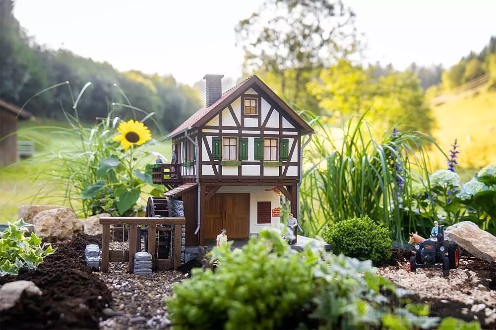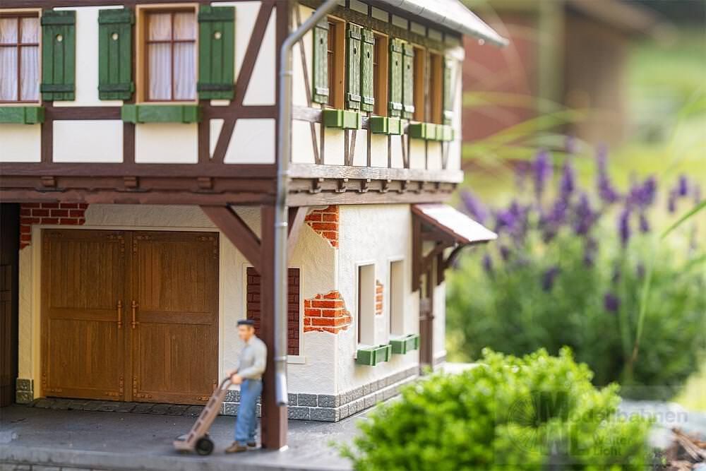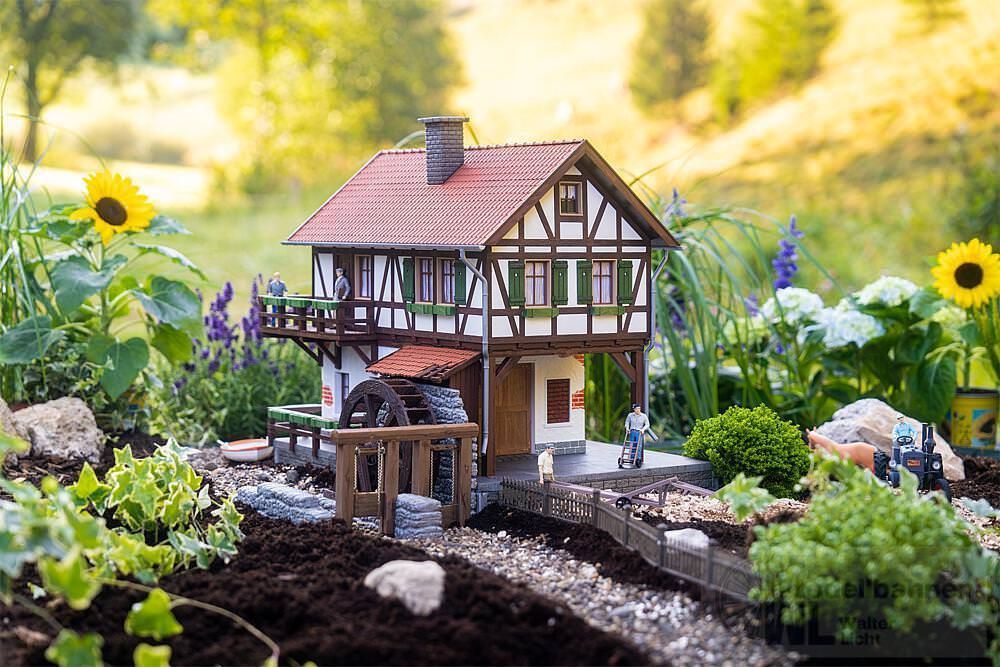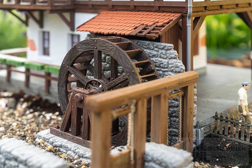 Das Hauptgebäude der Wassermühle ist im traditionellen Fachwerkstil gebaut. Die stabilen Holzbalken des Fachwerks sind in einem auffälligen Kontrast zu den weißen Putzflächen gehalten. An der Seite des Gebäudes befindet sich ein großes hölzernes Wasserrad, das mit dem »Synchron-Antriebsmotor«, Art. Nr. 330090, 12-16 V, Wechselspannung, angetrieben werden kann. Motor nicht beiliegend. Die Türen, das Tor sowie die Stellfallen beim Wasserrad sind manuell beweglich.