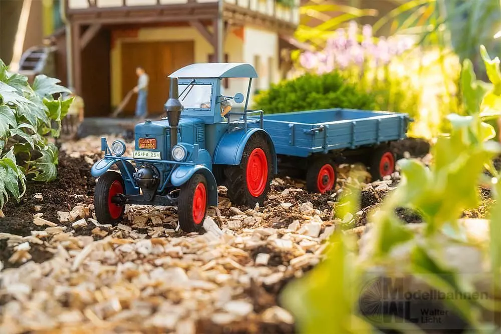 Modell eines blauen Lanz Verkehrsbulldog D1506 Traktors mit roten Felgen und einem passenden Anhänger. Die Bordwände des Anhängers sind aufklappbar, zudem sind die Deichsel und die Räder beweglich. Über das Lenkrad lässt sich die Richtung der Vorderräder steuern. Weitere Besonderheiten sind das Dach über dem gefederten Fahrersitz sowie die breiten Kotflügel an den Vorder- und Hinterrädern des Traktors.