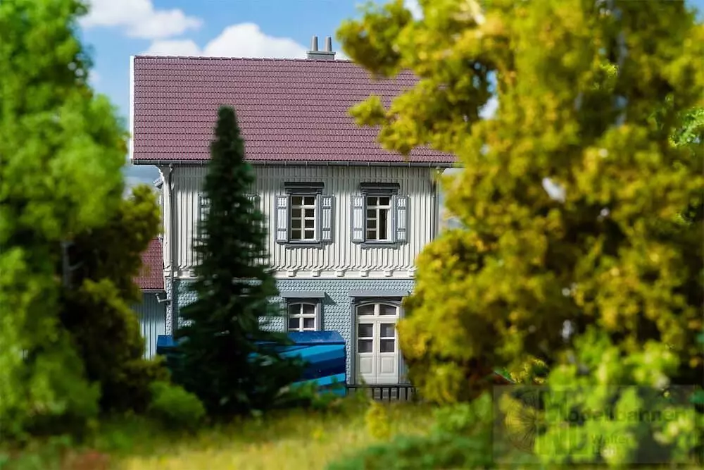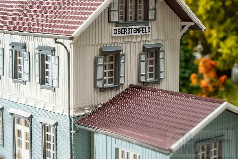 Langsam rollt der Zug ins Gleis, und die Fahrgäste auf dem Bahnsteig bereiten sich auf die Abfahrt vor. Der Bahnhof mit seiner hellblau-weißen Holzfassade, gestaltet nach dem Originalvorbild von Oberstenfeld, ist ein echter Blickfang auf der Modellanlage. Oberstenfeld liegt an der Bottwartalbahn zwischen Marbach und Heilbronn. Nach der Stilllegung der Bahn wurde der Bahnhof restauriert und dient heute als örtlicher Gemeindetreff. Er verkörpert den Charme eines typischen Kleinstadtbahnhofs, voller liebevoller Details, die ihm einen besonderen Charakter verleihen.