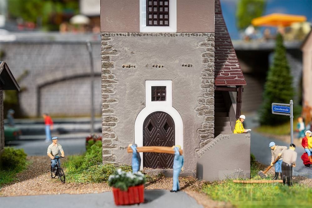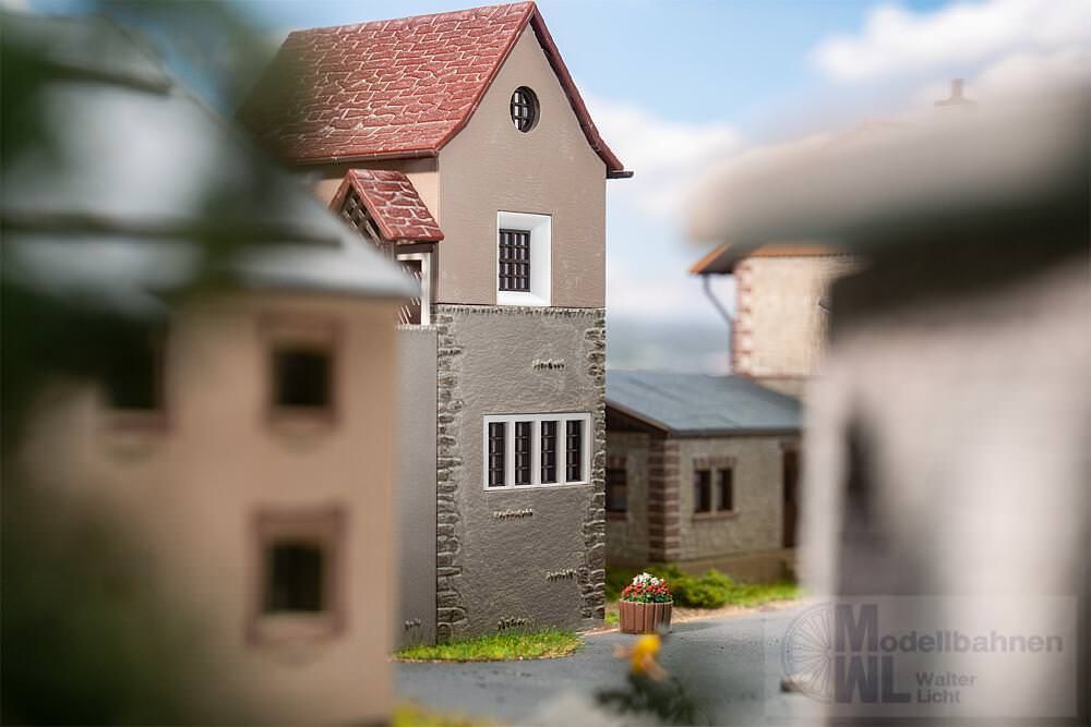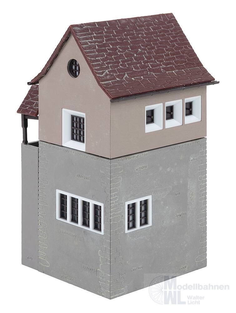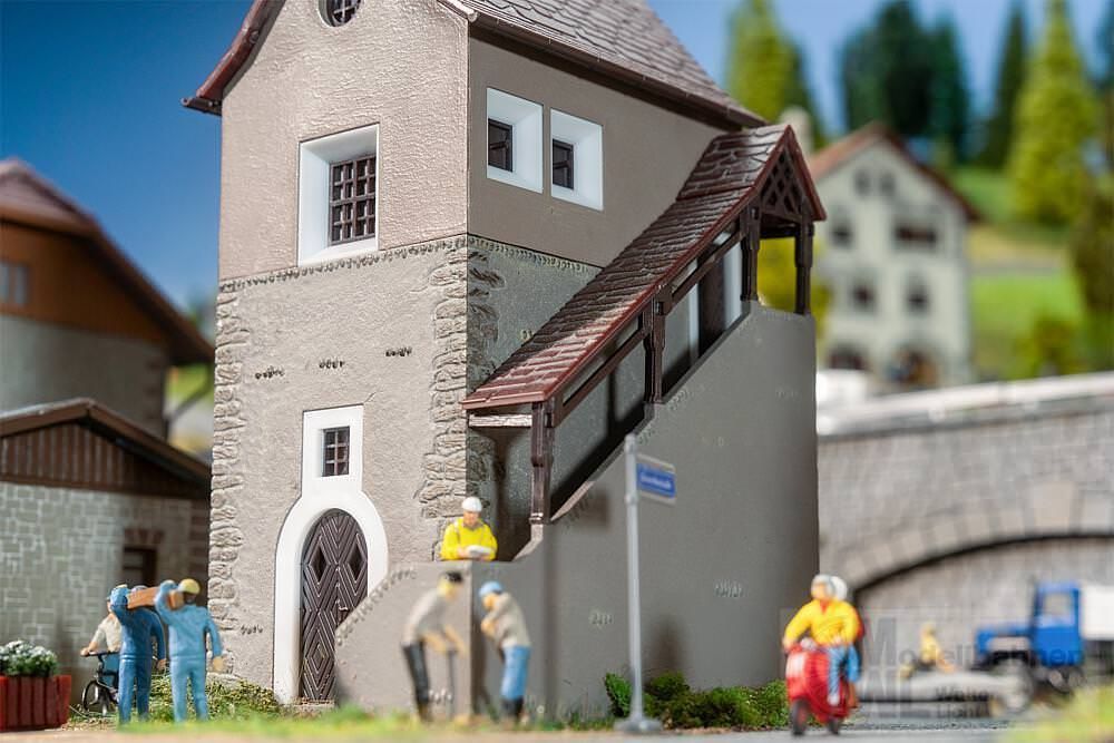 Der gemauerte Modell-Schaltturm besticht durch seine steinsichtige Putzfassade, die ihm einen robusten Charakter verleiht. Eine überdachte Außentreppe führt zum Eingang hinauf und das Satteldach mit roten Steinplatten verleiht dem Gebäude eine klassische Note. Das Modell orientiert sich an einem regionaltypischen Schaltturm der Rhätischen Bahn (RhB) beim Bahnhof Zuoz. Das Original, das um 1913 entstand, diente der Steuerung von Bahnanlagen und ist ein beeindruckendes Beispiel für die funktionale Architektur seiner Zeit. Dieses historische Vorbild verleiht dem Modell eine besondere Authentizität und macht es zu einem Highlight für Liebhaber der Rhätischen Bahn.