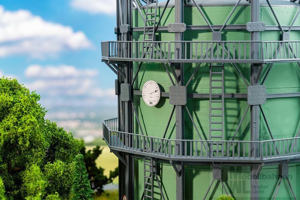 Mit diesem Gasometer samt Rohrleitungen hält die Schwerindustrie Einzug in Ihre Modellbauanlage. Das Modell überzeugt mit einem stabilen Stahlgerüst, Laufstegen und Leitern, die Wartungswege und Zugänge nachbilden. Ein großes Druckmessinstrument sowie Warn- und Hinweisschilder verleihen dem Gasometer zusätzlichen Realismus und unterstreichen seinen industriellen Charakter. Das detailgetreue Modell lässt sich perfekt mit den neuen Rohrleitungs-Sets (Art. 180327 und Art. 180328) kombinieren und kann in zwei unterschiedlichen Höhen aufgebaut werden.