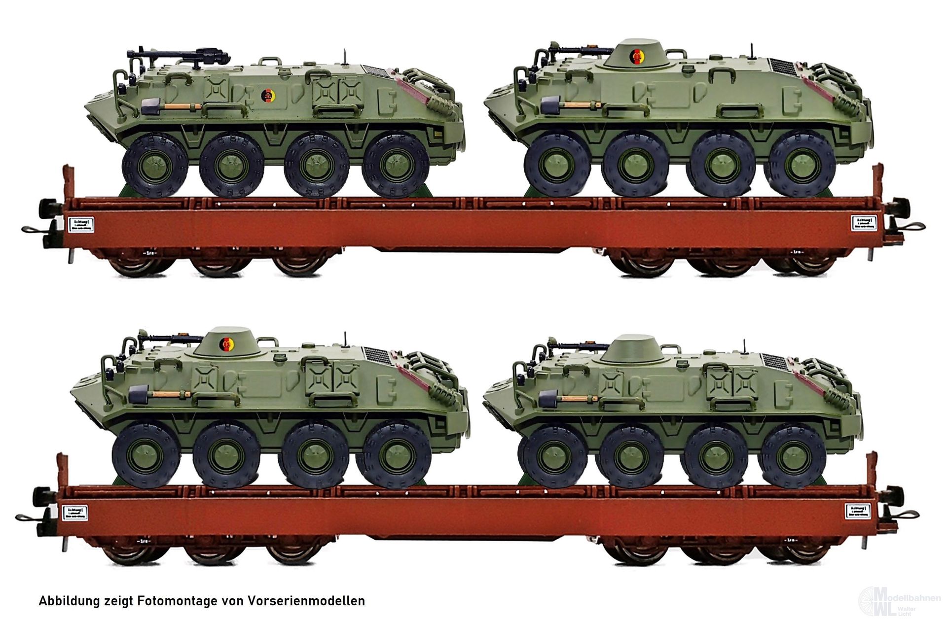 Militärtransport SPW 60, mit verschiedenen Panzerwagen 2teilig DR (Epoche IV): Zwei Schwerlastwagen der Bauart Samms 4860 mit abgeklappten Seitenwänden, braun einfarbig, beladen mit je zwei Schützenpanzern SPW 60 PB