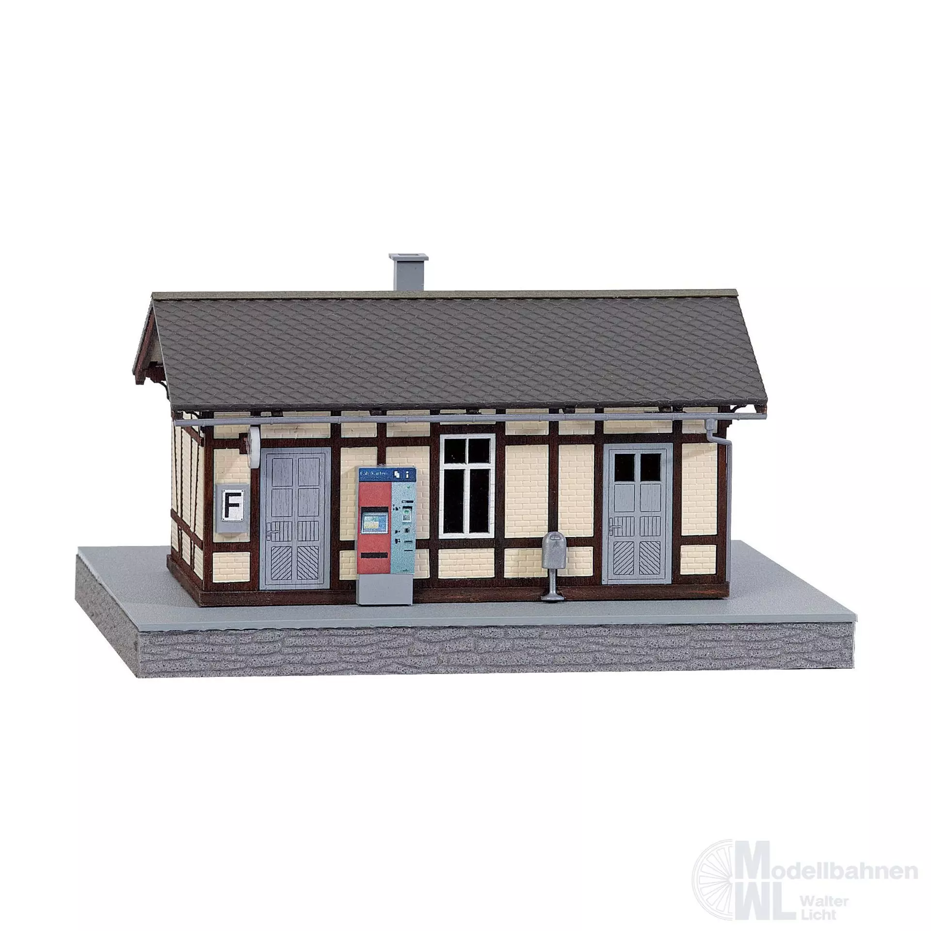 Nachbildung eines kompakten und attraktiven Haltepunktes nach einem Vorbild bei Bopfingen/Baden-Württemberg. Fachwerk in Echtholz bereits farbig gebeizt. Mit Uhr, Fernsprecherkasten, Abfallkorb und Fahrkartenautomat. Bausatz.