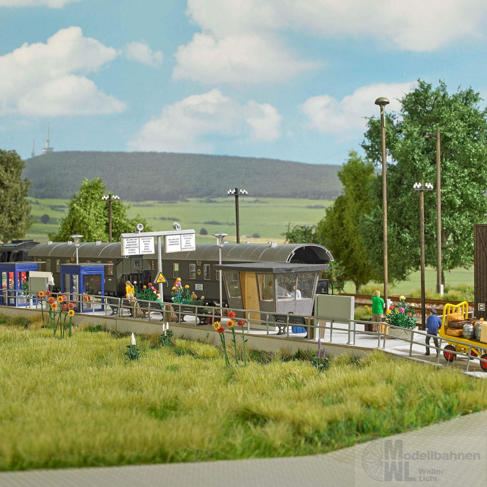 Bausatz für einen Bahnsteig inklusive Güterrampe und zwei Wartehäuschen. Passend für alle Bahnhöfe.