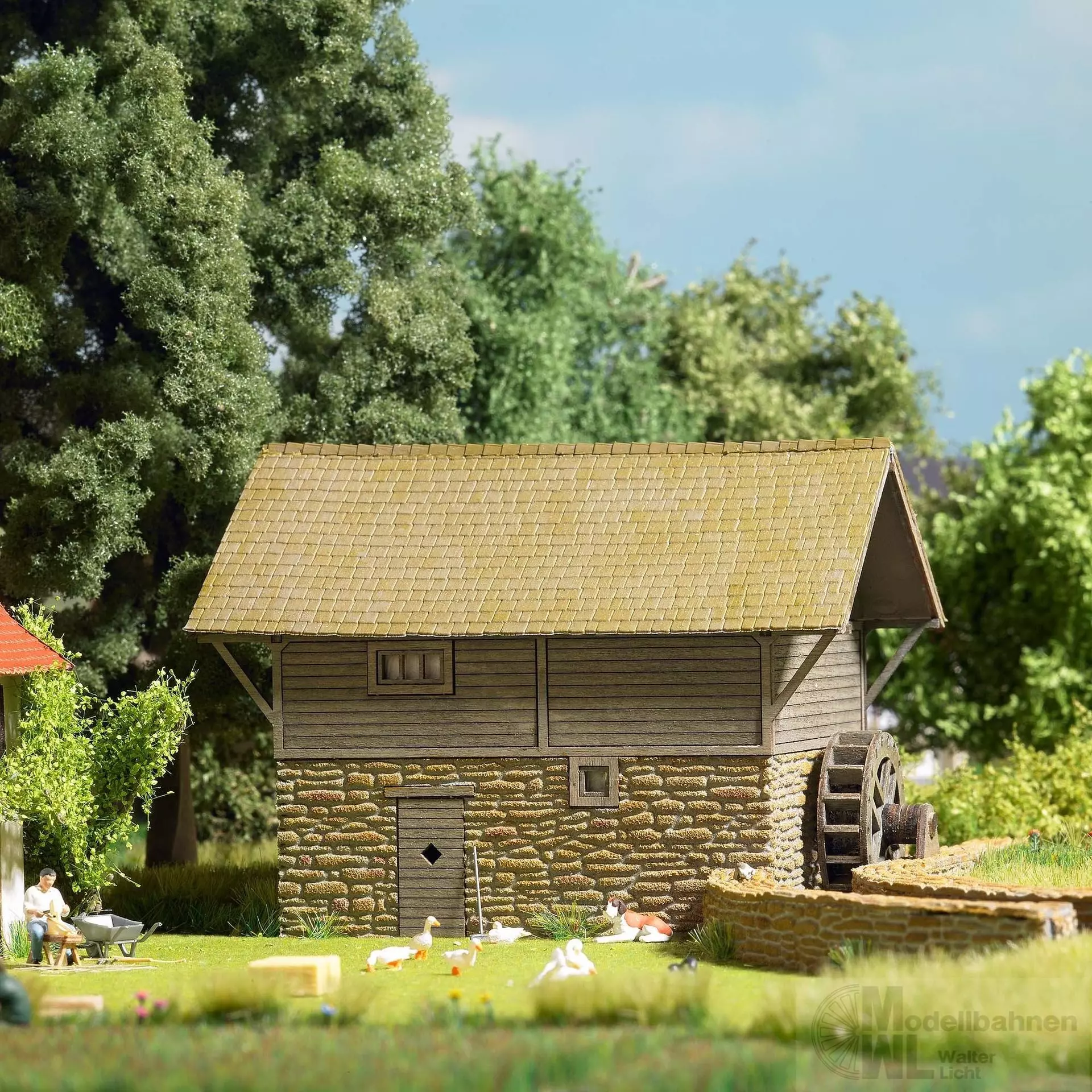 Schwarzwald. Gebäudefassade in Steinoptik und aus echtem Holz. Die Mühle kann mit dem Faller®-Bastelmotor Nr. 180629 zum Funktionsmodell erweitert werden.