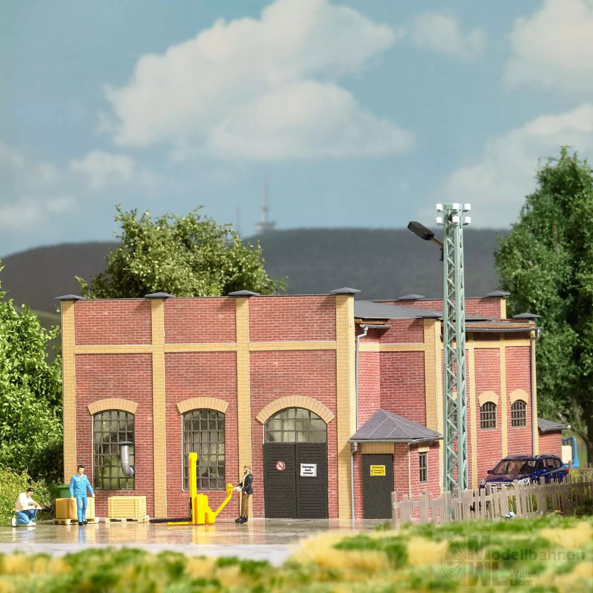 Bausatz für ein authentisches Fabrikgebäude aus der Jugendstilepoche. Als Vorbild dient das Kraftwerk »Kammerl« in Oberbayern, das nach seiner Renovierung nun wieder mit dem ursprünglich verwendeten, ziegelroten Mauerwerk erstrahlt. Fassade mit detailreicher Verarbeitung auf allen Gebäudeseiten. Die halbrunden Fensterstürze sind ebenso typisch für die damalige Architektur wie die klassischen Sprossenfenster mit filigranen Holzrahmen und die großen Holztore (alles Echt-Holz). Vielseitig einsetzbar als Industrie-, Handwerks- und Maschinengebäude oder Loft. Vorbereitet für den Einbau einer Innenbeleuchtung z.B. mit Busch LEDs 5998. Größe: 165 x 149 mm, 82 mm hoch.