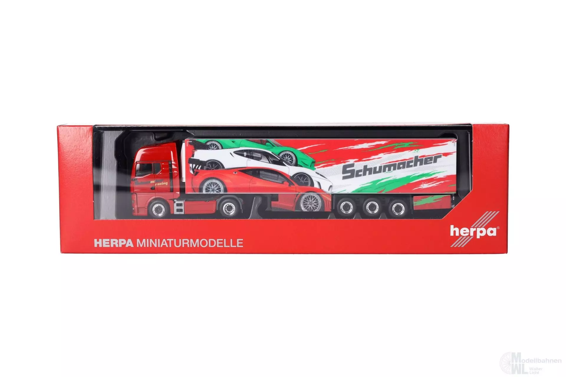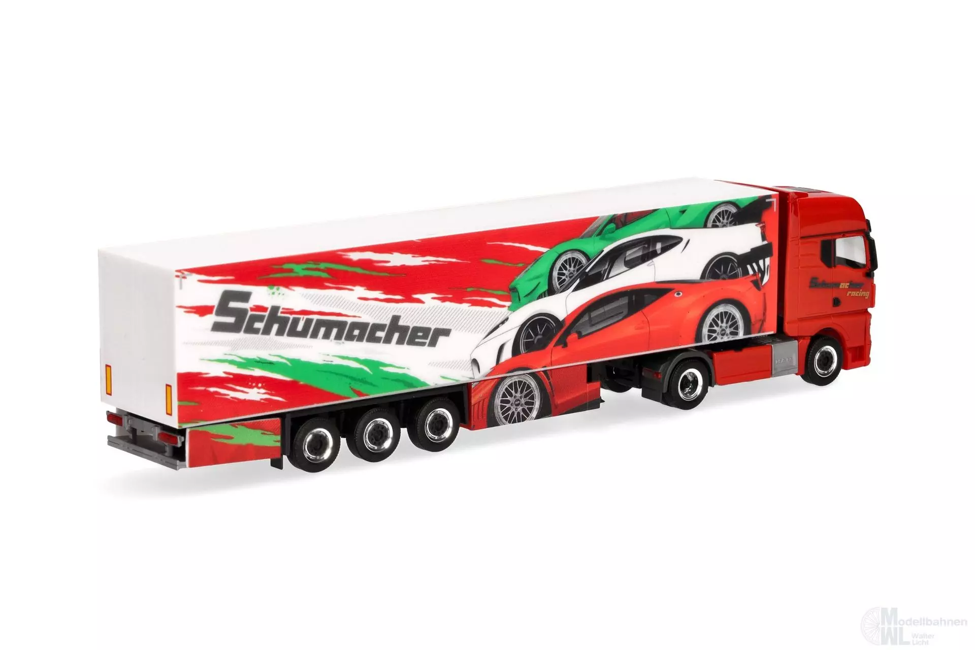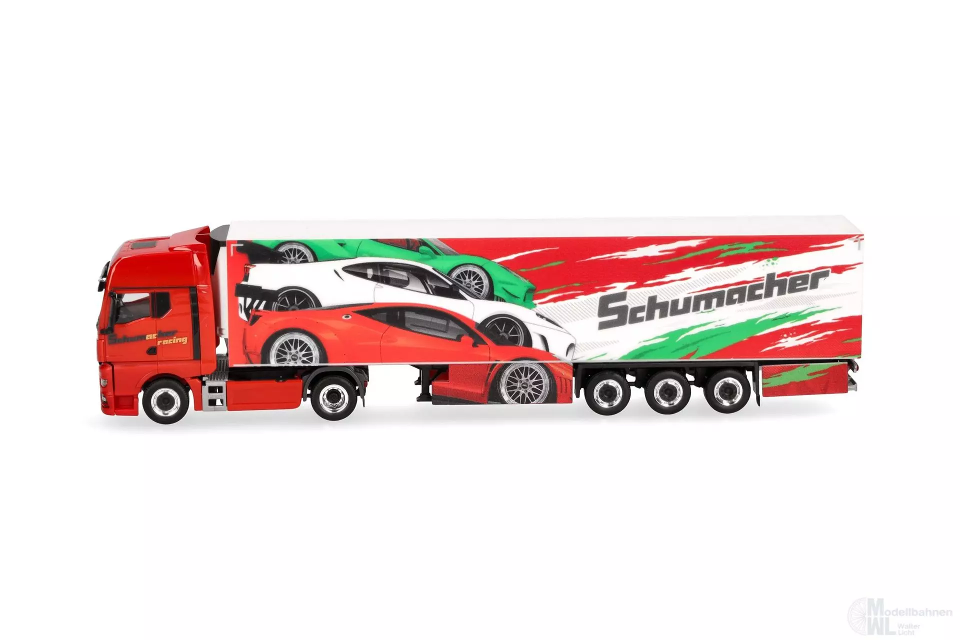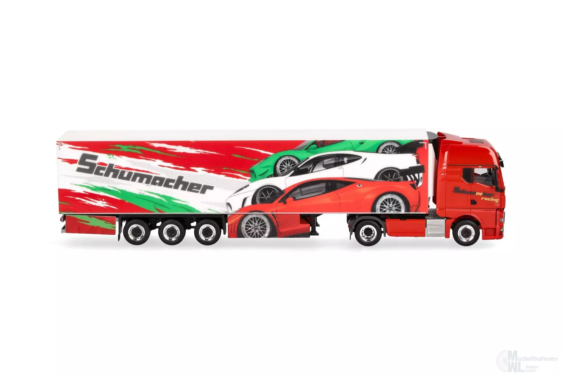 Die Spedition Schumacher aus Würselen hat vornehmlich andere Marken als MAN im Fuhrpark. Doch nach einem Ausreiser 2016 (306263) scheint der Münchener LKW-Hersteller keinen allzu schlechten Eindruck hinterlassen zu haben. Der rote MAN TGX GX zieht einen auffälligen Kühlkofferauflieger mit italienischem Sportwagenflair. Das Modell erscheint in einmaliger Auflage. (Nordrhein-Westfalen/Würselen)