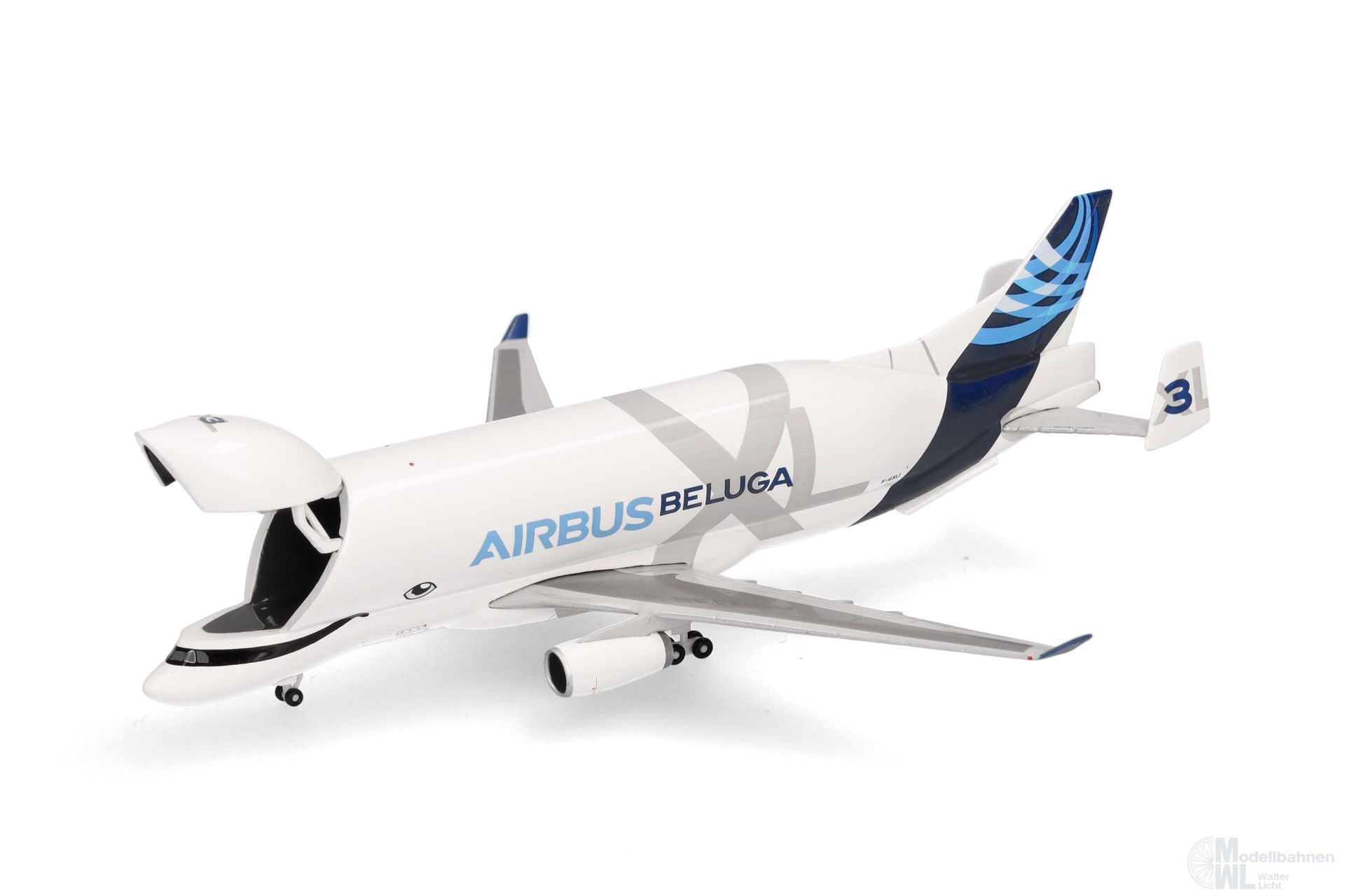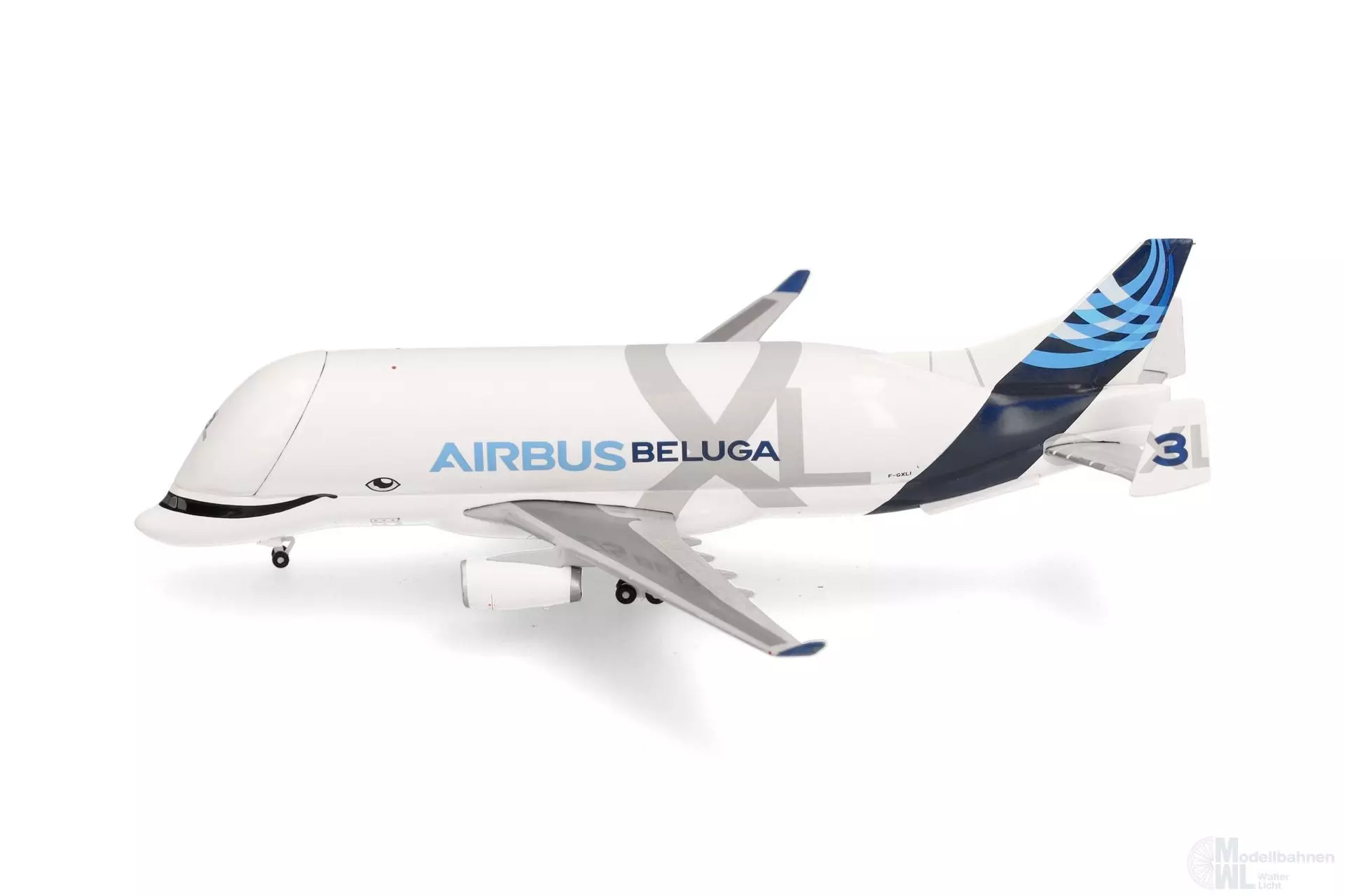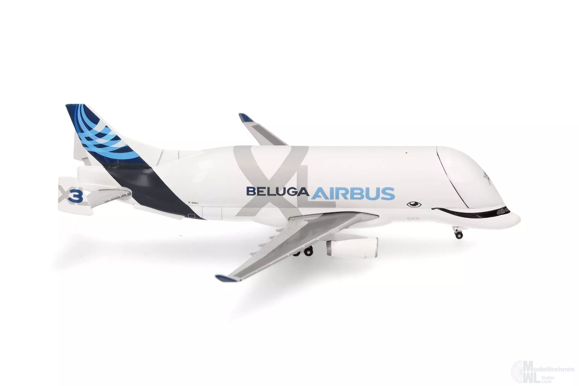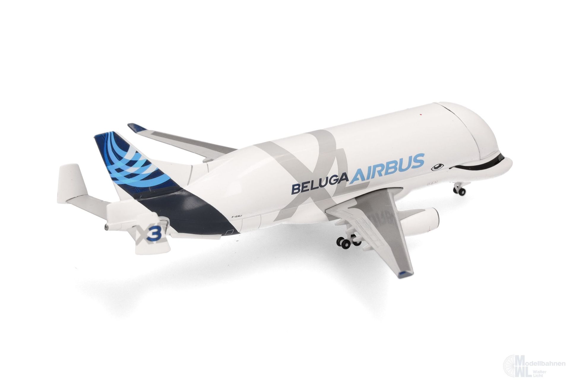 Weil Airbus vor allem für die Serienproduktion der A350 XWB zusätzliche Frachtraumkapazität benötigt und die stark genutzte Beluga-Flotte außerdem in die Jahre gekommen war, startete der Flugzeughersteller Anfang der 2010er-Jahre mit Studien zur Entwicklung eines Nachfolge-Modells, was ab 2014 zu konkreten Planungen führte. Die Wahl fiel auf die A330-200F als Basis für den neuen Teiletransporter, wobei vor allem die kurzen Pisten der Flughäfen Hawarden in Wales und in Bremen den Ausschlag für die kleinere Variante der A330 gaben. Der Beluga XL ist mit 63 Meter Länge und 19 Meter Höhe gut sechs Meter länger als das Vorgängermodell A300-600ST, hat einen 1,1 Meter breiteren Rumpf und ein um fast 1.000 m³ größeres Ladevolumen von 2.209 m³. Genau das war entscheidend, um künftig zum Beispiel zwei statt nur eine Tragfläche einer A350 transportieren zu können. Äußerlich am leichtesten erkennbar ist die XL an ihrem Lächeln, das die Optik des Wals noch verstärkt. F-GXLI wurde Oktober 2020 als dritte von derzeit sechs BelugaXL-Transportern in Dienst gestellt. Das aus Metall gefertigte Modell wird mit einem Austauschteil aus Kunststoff gefertigt, wodurch es wahlweise mit geöffnetem und geschlossenem Bugtor dargestellt werden kann.