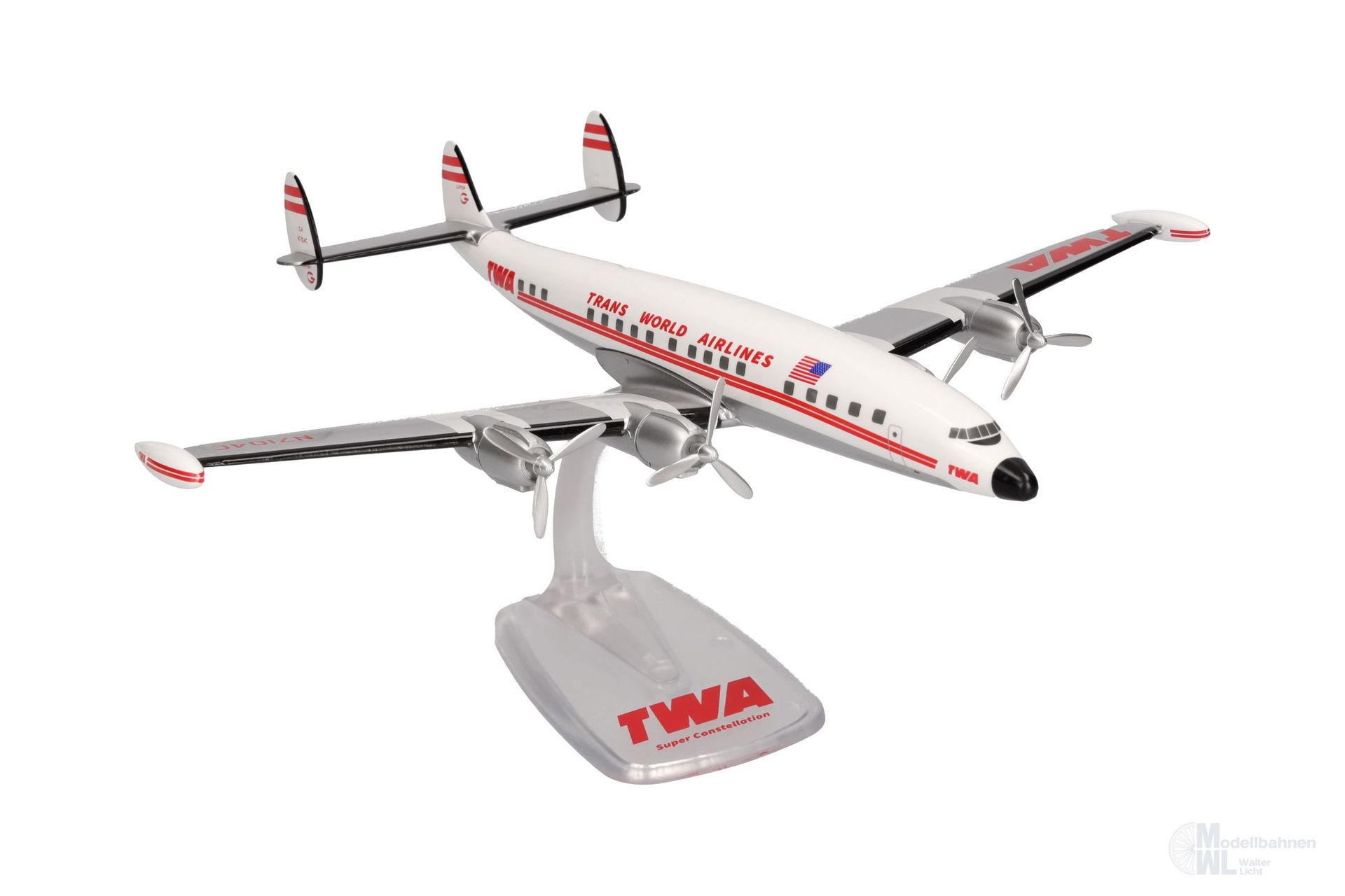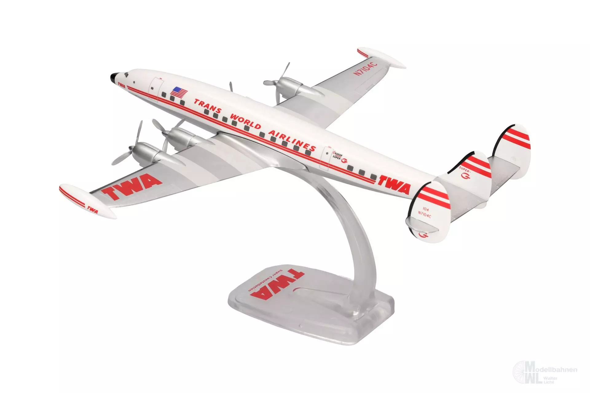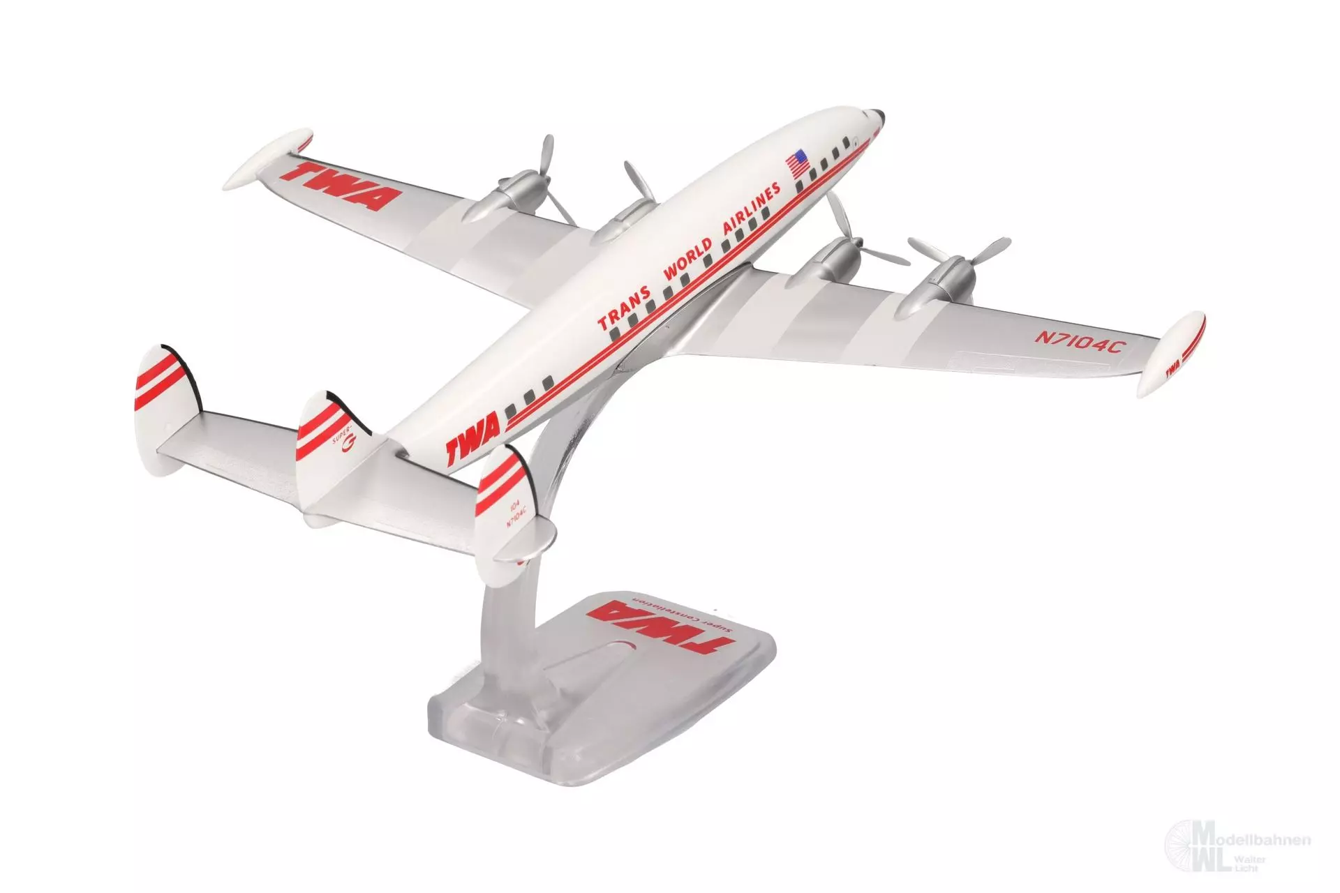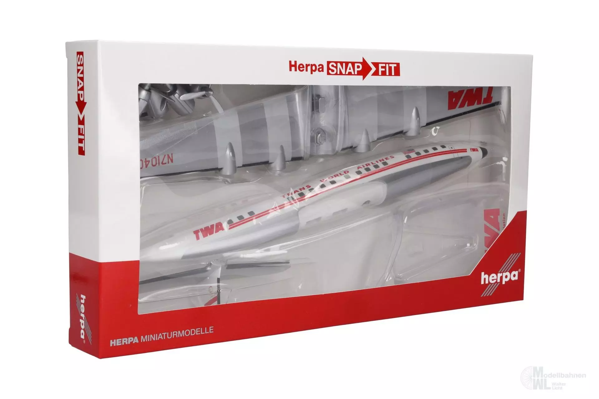Der zu seiner Zeit berühmte Pilot und Wirtschaftsmagnat Howard Hughes und seine Transcontinental & Western Air (später Trans World Airlines, oder schlicht TWA) waren Ende der 1930er Jahre maßgeblich an der Entwicklung der Lockheed Constellation Flugzeugfamilie beteiligt. Nach dem Ende des Zweiten Weltkriegs ging die Entwicklung rasant voran, bis hin zur L-1049 Super Constellation, von der TWA insgesamt 47 Exemplare meist auf Langstreckenrouten ab 1951 bis 1968 einsetzte. Bis heute gilt die legendäre Super Connie als eines der elegantesten und bekanntesten Flugzeuge der zivilen Luftfahrt. SnapFit-Modelle von Herpa überzeugen mit einem unschlagbaren Preis-/Leistungsverhältnis. Sie werden mit einem Display-Stand geliefert und sind mit wenigen Handgriffen ohne Kleber oder sonstigen Werkzeugen zusammengebaut.
