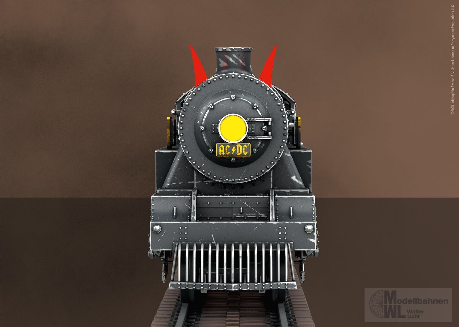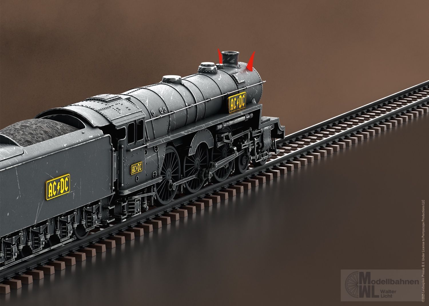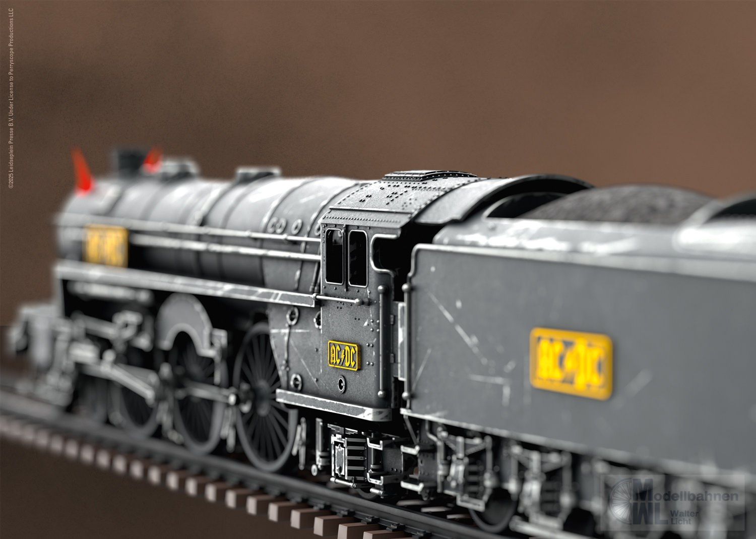 Modell: Mit Digital-Decoder mfx+ und umfangreichen Licht- und Soundfunktionen. Geregelter Hochleistungsantrieb mit Schwungmasse im Kessel. Drei Achsen angetrieben. Haftreifen. Lokomotive und Tender weitgehend aus Metall. Serienmäßig eingebauter Raucheinsatz, mit geschwindigkeitsabhängigem, dynamischem Rauchausstoß, digital schaltbar. Frontscheinwerfer mittig auf der Rauchkammertür der Lok und eine Lampe an der Tenderrückseite konventionell in Betrieb, digital schaltbar. Die Beleuchtung des Frontscheinwerfers kann auf rot umgeschaltet werden. Die AC/DC typischen Teufelshörner sind beleuchtet und können digital zugeschaltet werden. Führerstandsbeleuchtung und Feuerbüchsenflackern digital schaltbar. Beleuchtung des Tender-Durchgangs digital schaltbar. Beleuchtung mit wartungsfreien warmweißen und roten Leuchtdioden (LED). Verstellbare Kurzkupplung mit Kinematik zwischen Lok und Tender. Am Tender kinematikgeführte Kurzkupplung mit NEM-Schacht. Pufferhöhe an Lok und Tender nach NEM. Bremsschläuche, Schraubenkupplungsimitationen und geschlossene Zylinderdeckel liegen bei. Länge über Puffer ca. 24,5 cm.