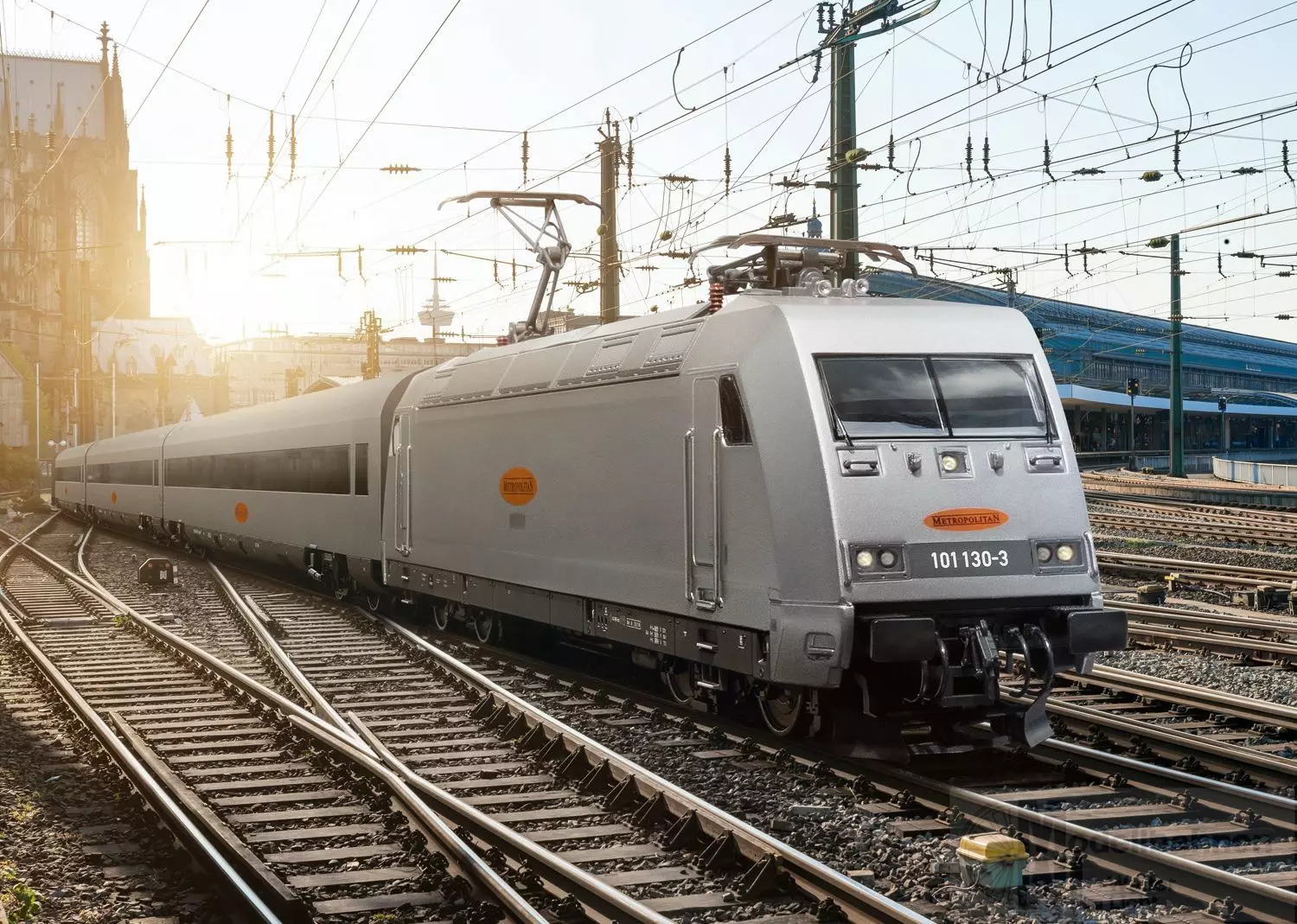 Vorbild: Zugpackung MET besteht aus Schnellzuglokomotive Baureihe 101, 1 Schnellzugwagen Apmz 116.0 Ordnungsnummer 1, 1 Schnellzugwagen Apmz 116.2 Ordnungsnummer 2, 1 Schnellzugwagen Apmkz 116.6 Ordnungsnummer 3, 1 Schnellzugwagen Apmz 116.4 Ordnungsnummer 4, 1 Schnellzugwagen Apmz 116.4 Ordnungsnummer 5, 1 Schnellzugwagen Apmkz 116.6 Ordnungsnummer 6 und 1 Schnellzug-Steuerwagen Apmbzf 116.8 Ordnungsnummer 7. Lokomotive und Schnellzugwagen in silbergrauer Grundfarbgebung mit Metropolitan-Logos. Einsatzstrecke Hamburg - Köln, mit Zwischenhalte in Essen und Düsseldorf. Deutsche Bahn AG (DB AG), Geschäftsbereich Metropolitan Express Train GmbH / DB Reise und Touristik. Lok-Betriebsnummer 101 130-3. Betriebszustand zwischen August 1999 und September 2001.
