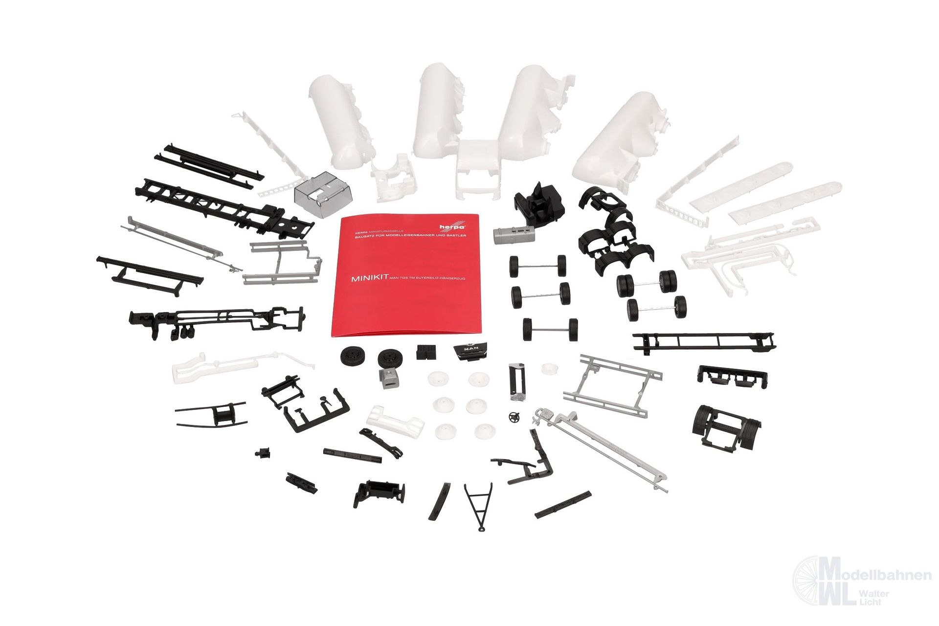 Mit neuem MAN TGS NN Fahrerhaus wird der Silo-Hängerzug nun auch zur freien Gestaltung als Minikit-Bausatz in weißer mGrundfarbe angeboten