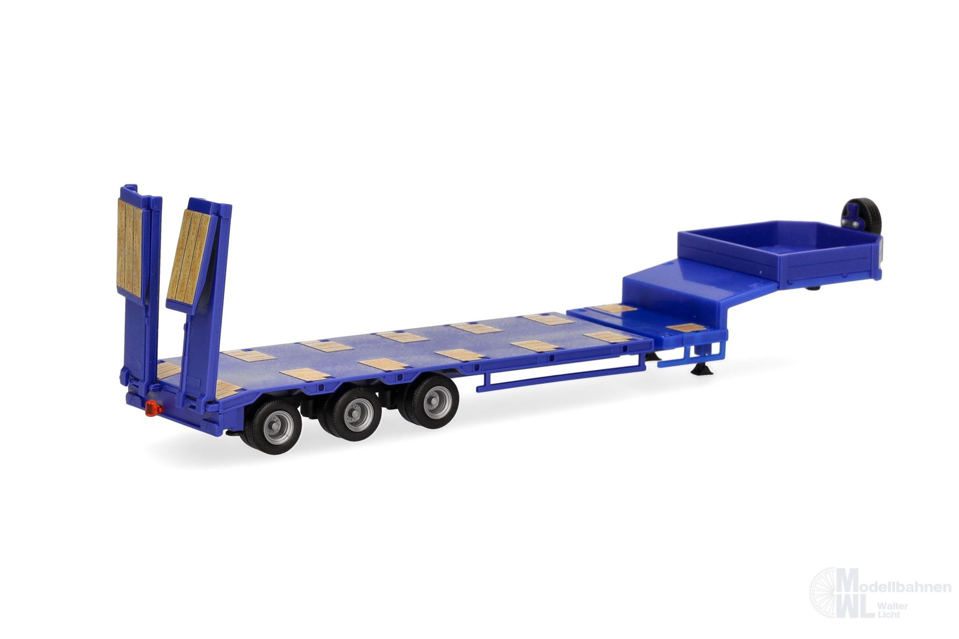 Der Dauerbrenner im Auflieger- und Anhänger Sortiment ist dieser 3achsige Semitieflader (Goldhofer) mit Auffahrrampen. Nachdem bereits viele Farben erschienen sind, wird er nun in ultramarinblau (THW) erscheinen (076371-010), dennoch aber natürlich mit der Holzmaserung bedruckt.