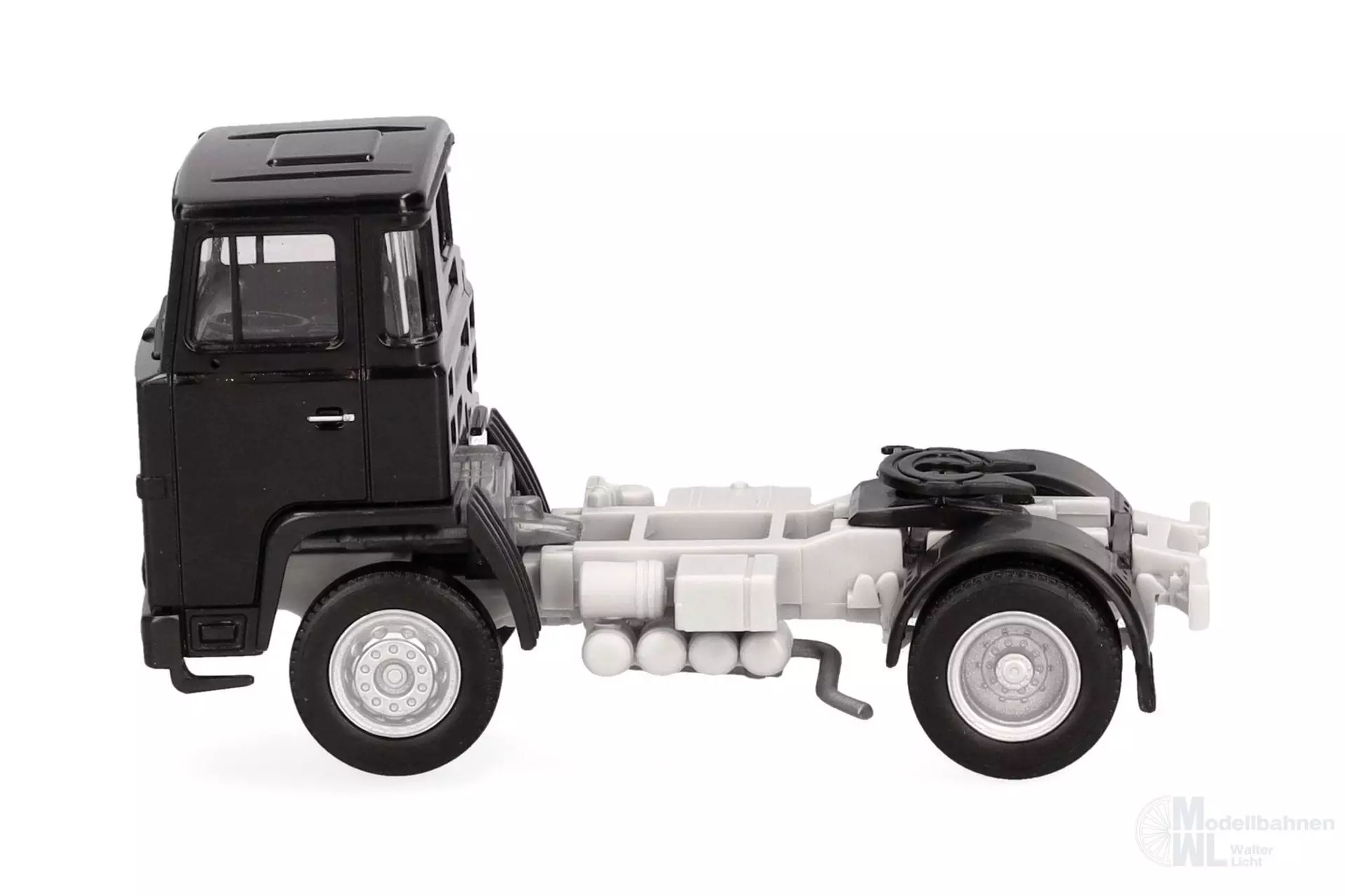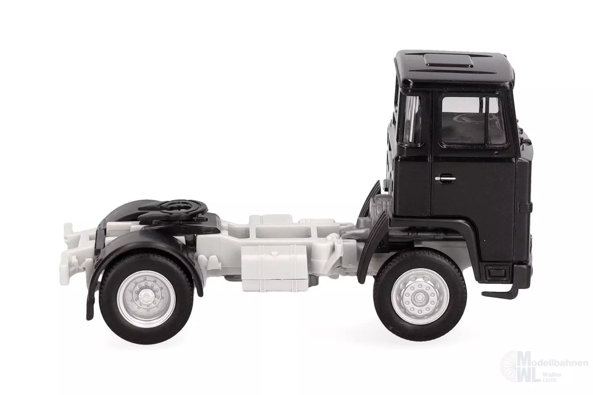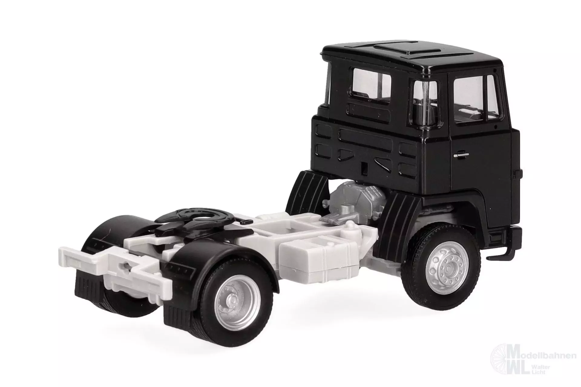 Die klassische Scania 111 Zugmaschine mit Nahverkehrs-Fahrerhaus erscheint in neuer Farbgebung schwarz.